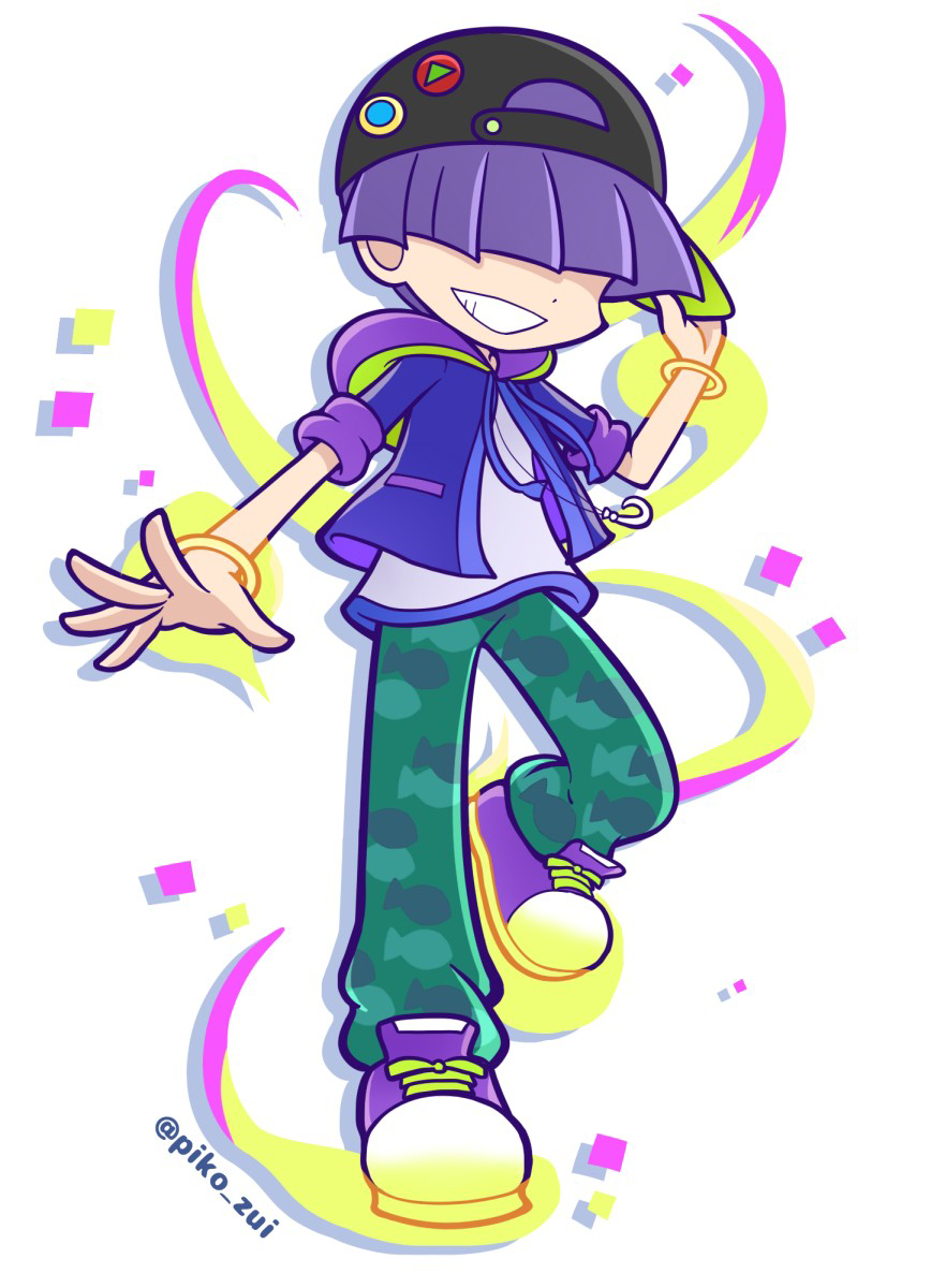 1boy adjusting_clothes adjusting_headwear animal_print artist_name baseball_cap black_hat blunt_bangs bracelet deformed dot_nose drawstring drop_shadow fish_print full_body green_pants grin hair_over_eyes hand_up hat highres hood hoodie jewelry knee_up long_bangs male_focus necklace official_alternate_costume official_style open_clothes open_hand open_hoodie outstretched_arm pants purple_hair purple_hoodie puyopuyo puyopuyo_quest sasaki_maguro shirt shoes short_hair sideways_hat sleeves_rolled_up smile sneakers solo standing standing_on_one_leg takazaki_piko white_background white_shirt