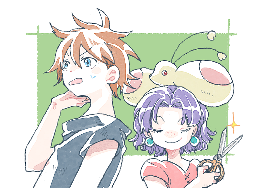 1boy 1girl blue_eyes closed_mouth earrings freckles grandia grandia_i jewelry justin_(grandia) michibata_65 open_mouth purple_hair puui_(grandia) scissors short_hair smile sue_(grandia)