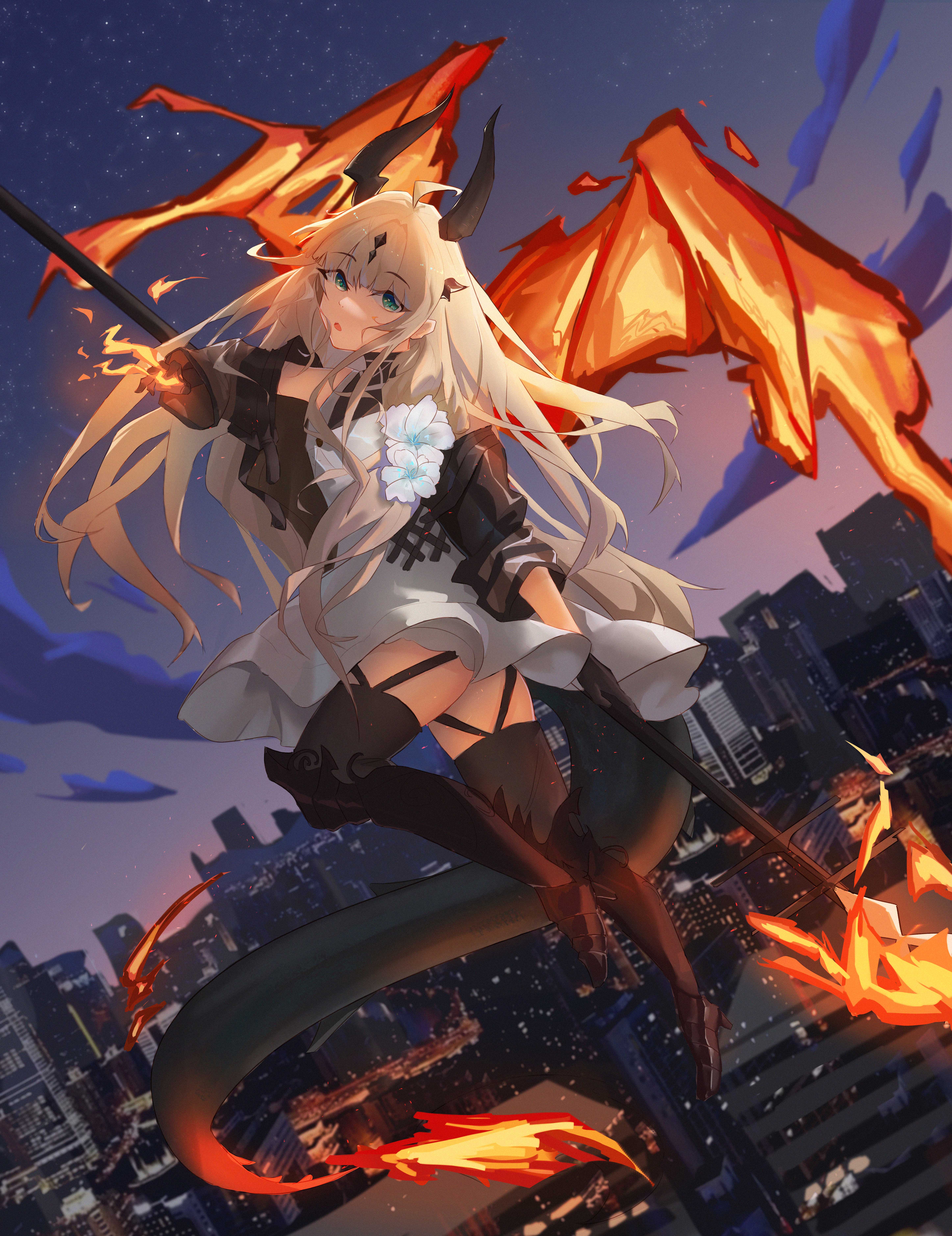 1300dudekafeibei 1girl absurdres ahoge arknights black_gloves black_horns black_jacket black_tail black_thighhighs blonde_hair cityscape dragon_girl dragon_horns dragon_tail dress fiery_tail fiery_wings fire flame-tipped_tail flower full_body gloves green_eyes highres holding holding_staff horns jacket long_hair long_sleeves looking_at_viewer multiple_horns reed_(arknights) reed_the_flame_shadow_(arknights) solo staff tail thighhighs very_long_tail white_dress wings