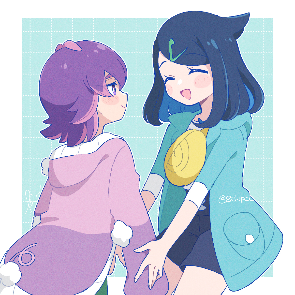 0zr8hc 2girls black_hair black_shorts blush closed_mouth cowlick dot_(pokemon) eyelashes hair_ornament hair_over_eyes hairclip highres holding jacket liko_(pokemon) long_sleeves multicolored_hair multiple_girls nintendo open_clothes open_mouth pants pink_hair pokemon pokemon_(anime) pokemon_horizons purple_eyes purple_hair shirt short_hair shorts smile white_shirt