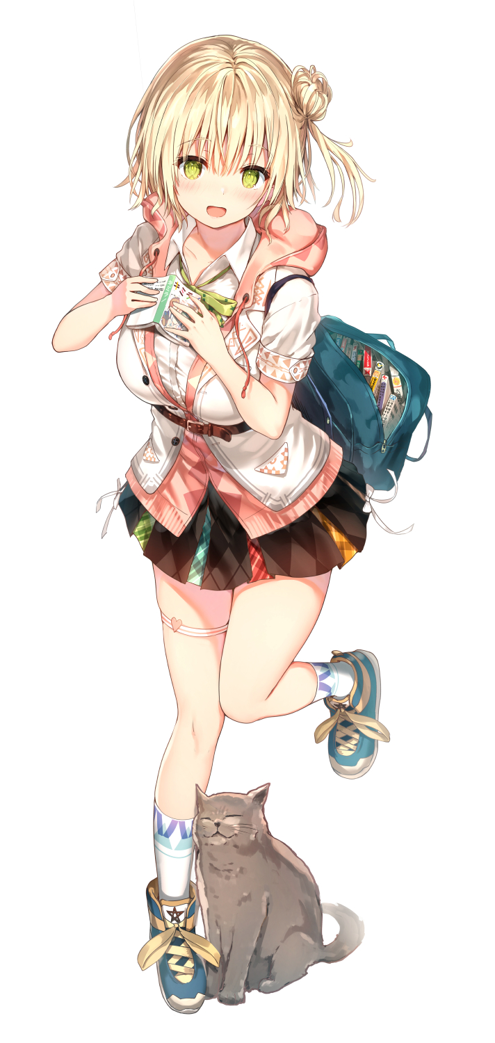 1girl ankle_socks bag belt_around_waist blonde_hair blue_shoes blush book breasts cat collarbone collared_shirt full_body green_eyes green_ribbon hair_bun hands_up highres holding holding_book hood hood_down hooded_jacket jacket kimirano large_breasts leg_up looking_at_viewer neck_ribbon nekoyashiki_karen one_eye_closed open_mouth pink_hood pleated_skirt ribbon school_bag shirt shoes short_hair short_sleeves simple_background single_hair_bun skirt sneakers socks solo standing standing_on_one_leg sune_(mugendai) thigh_strap white_background white_shirt white_socks