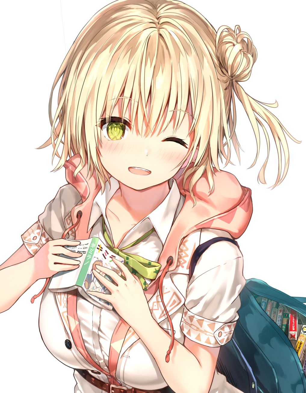 1girl bag belt_around_waist blonde_hair blush book breasts close-up collarbone collared_shirt green_eyes green_ribbon hair_bun hands_up highres holding holding_book hood hood_down hooded_jacket jacket kimirano large_breasts looking_at_viewer neck_ribbon nekoyashiki_karen one_eye_closed open_mouth pink_hood ribbon school_bag shirt short_hair short_sleeves simple_background single_hair_bun skirt solo standing sune_(mugendai) teeth upper_body upper_teeth_only white_background white_shirt