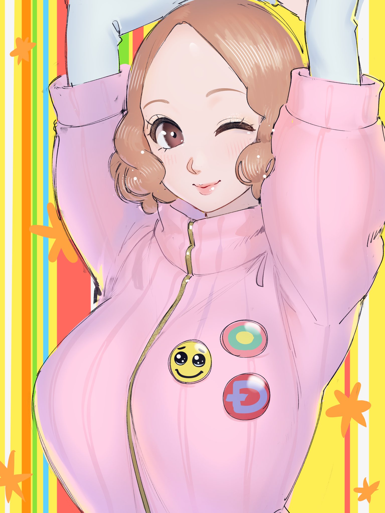 1girl arms_up badge breasts brown_eyes brown_hair button_badge front_zipper hand_on_own_arm highres large_breasts light_blush long_sleeves looking_at_viewer okumura_haru one_eye_closed persona persona_4 persona_5 pink_sweater poechan_chan ribbed_sweater short-sleeved_sweater short_hair short_sleeves smile smiley_face striped_background sweater undershirt yellow_background