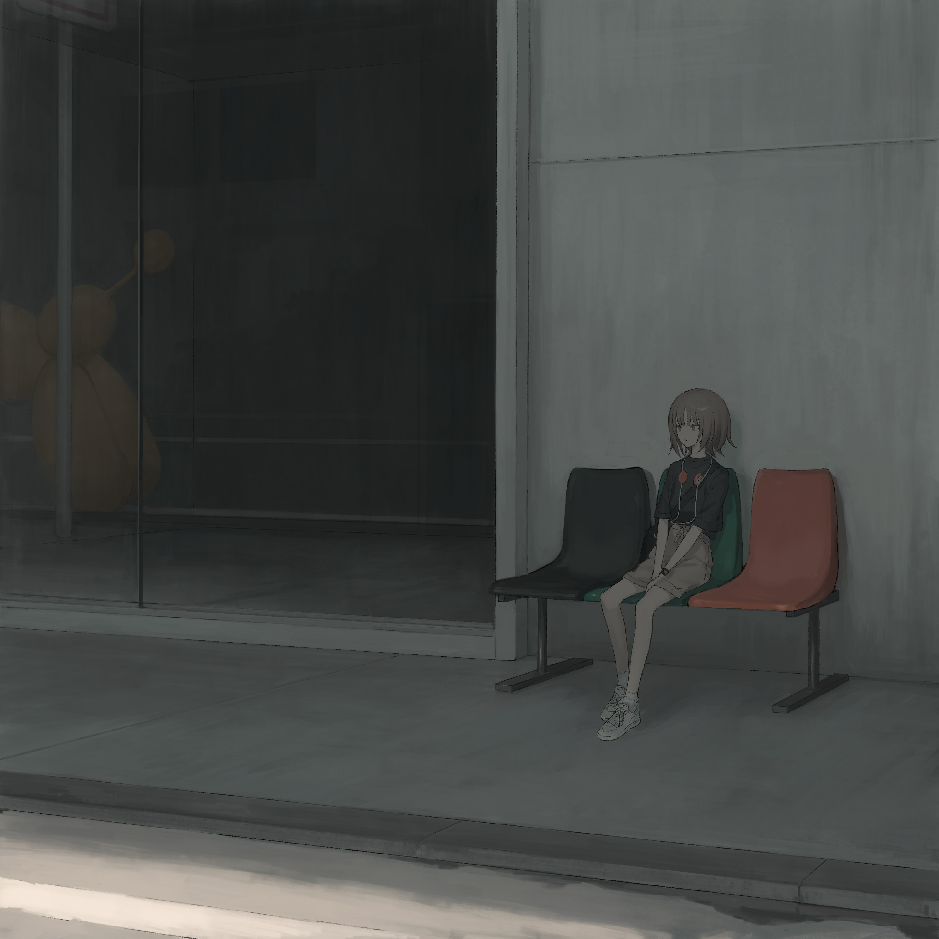 1girl absurdres bag balloon_animal bench black_shirt expressionless grey_hair grey_shorts hai_(haihki) headphones headphones_around_neck high-waist_shorts highres medium_hair original reflection shirt shoes short_sleeves shorts shoulder_bag sitting sneakers socks solo surreal v_arms watch wide_shot window wristwatch