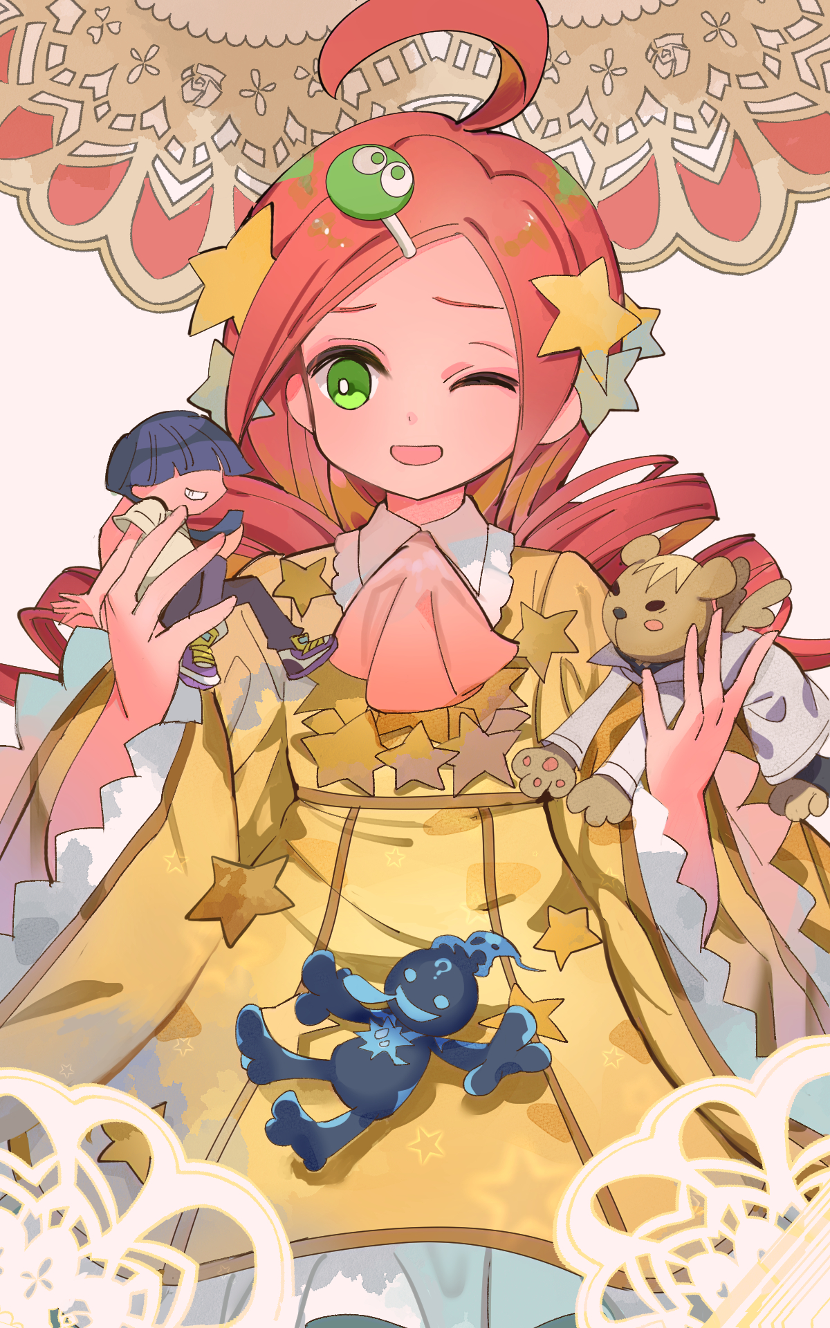 1girl 3boys ;d ahoge andou_ringo ascot bear border bright_pupils cardcaptor_sakura cardcaptor_sakura_clear_card_arc collar dress drill_hair ecolo_(puyopuyo) frilled_collar frills furisode_sleeves furrowed_brow furry furry_male green_eyes hair_ornament hairpin hand_up highres in_palm lace lace_border light_smile long_sleeves mini_person miniboy multiple_boys one_eye_closed open_mouth ornate_border pink_ascot puyopuyo puyopuyo_quest red_hair risukuma_(puyopuyo) sasaki_maguro side_part size_difference smile solo_focus star_(symbol) star_hair_ornament straight-on twin_drills urashima_(enediktb) white_background white_pupils wide_sleeves wing_collar yellow_dress