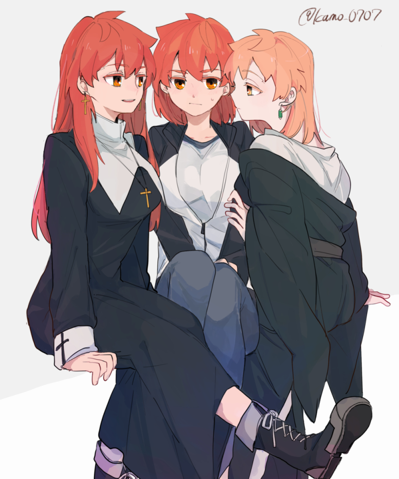 3girls alternate_universe artist_name black_footwear black_jacket blue_pants breasts cross cross_earrings cross_necklace earrings emiya_shirou fate/stay_night fate_(series) genderswap genderswap_(mtf) jacket japanese_clothes jewelry kamo_0707 kimono large_breasts long_hair multiple_girls necklace nervous_sweating nun orange_eyes orange_hair pants shirt short_hair smile sweat sweatdrop white_shirt yukata
