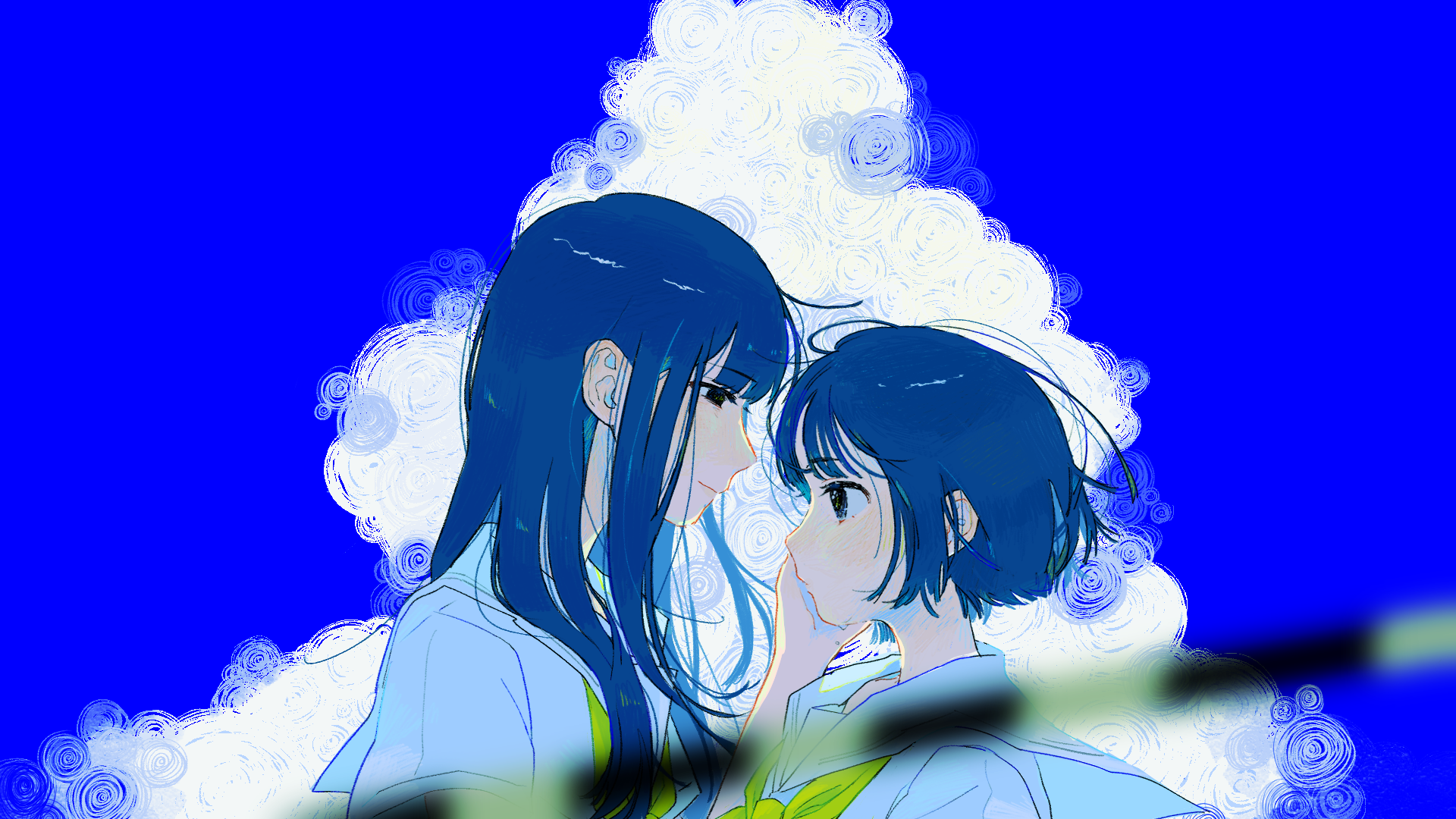 2girls blue_hair blue_sky blurry blurry_foreground boom_barrier cloud hand_on_another's_face highres long_hair looking_at_another multiple_girls neckerchief outdoors sailor_collar school_uniform serafuku shirt short_hair short_sleeves shoujo_rei_(vocaloid) skirt sky smile ushitaberu white_sailor_collar white_shirt yellow_neckerchief