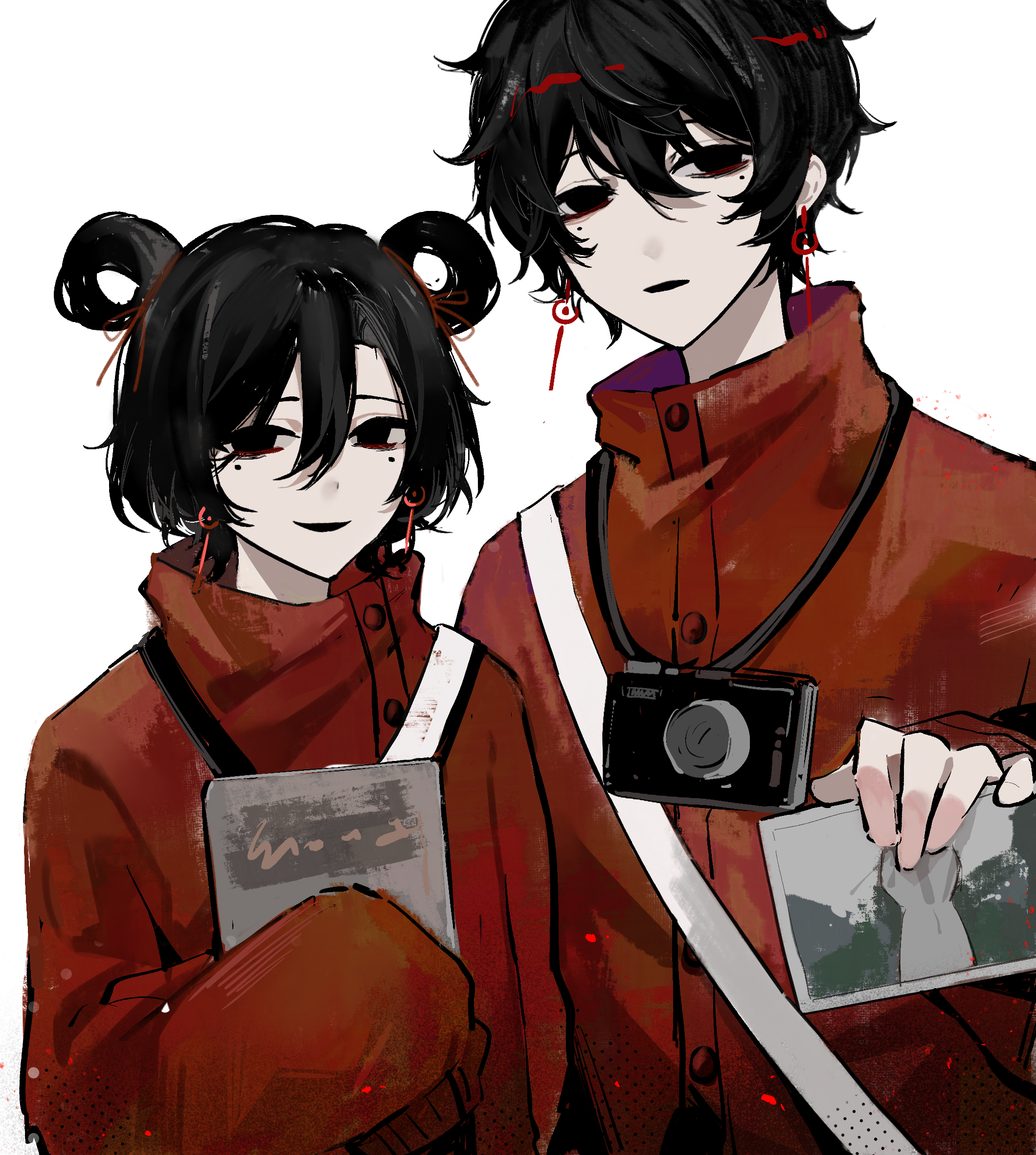 1boy 1girl black_eyes black_hair book camera camera_around_neck chinese_commentary commentary_request dual_persona earrings hair_between_eyes hair_rings high_collar highres holding holding_book holding_photo jacket jewelry li_yuting_(female) li_yuting_(male) long_sleeves mole mole_under_each_eye mole_under_eye multiple_moles niwatari_(xtgydl) open_mouth photo_(object) red_jacket short_hair sleeves_past_fingers sleeves_past_wrists smile solo touqi_guaitan white_background