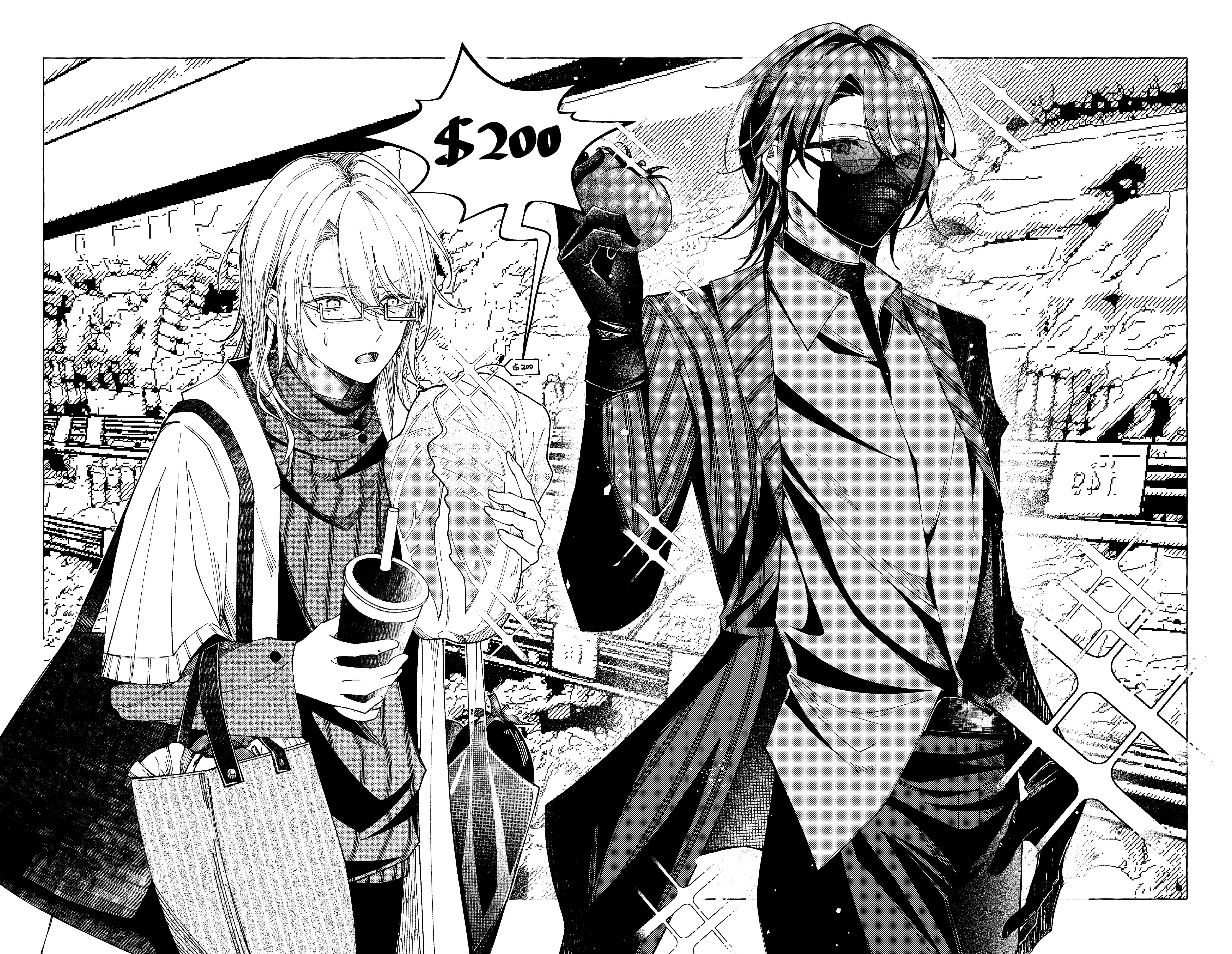 2boys absurdres bai_ling_(touqi_guaitan) chinese_commentary collared_shirt commentary_request cup disposable_cup food glasses gloves greyscale highres holding holding_cup holding_food holding_vegetable indoors jacket layered_sleeves lettuce liu_qingcheng long_sleeves male_focus mask monochrome mouth_mask multiple_boys open_clothes open_jacket open_mouth rectangular_eyewear semi-rimless_eyewear shirt short_hair short_over_long_sleeves short_sleeves sparkle sunglasses supermarket sweat tomato touqi_guaitan vegetable yunge