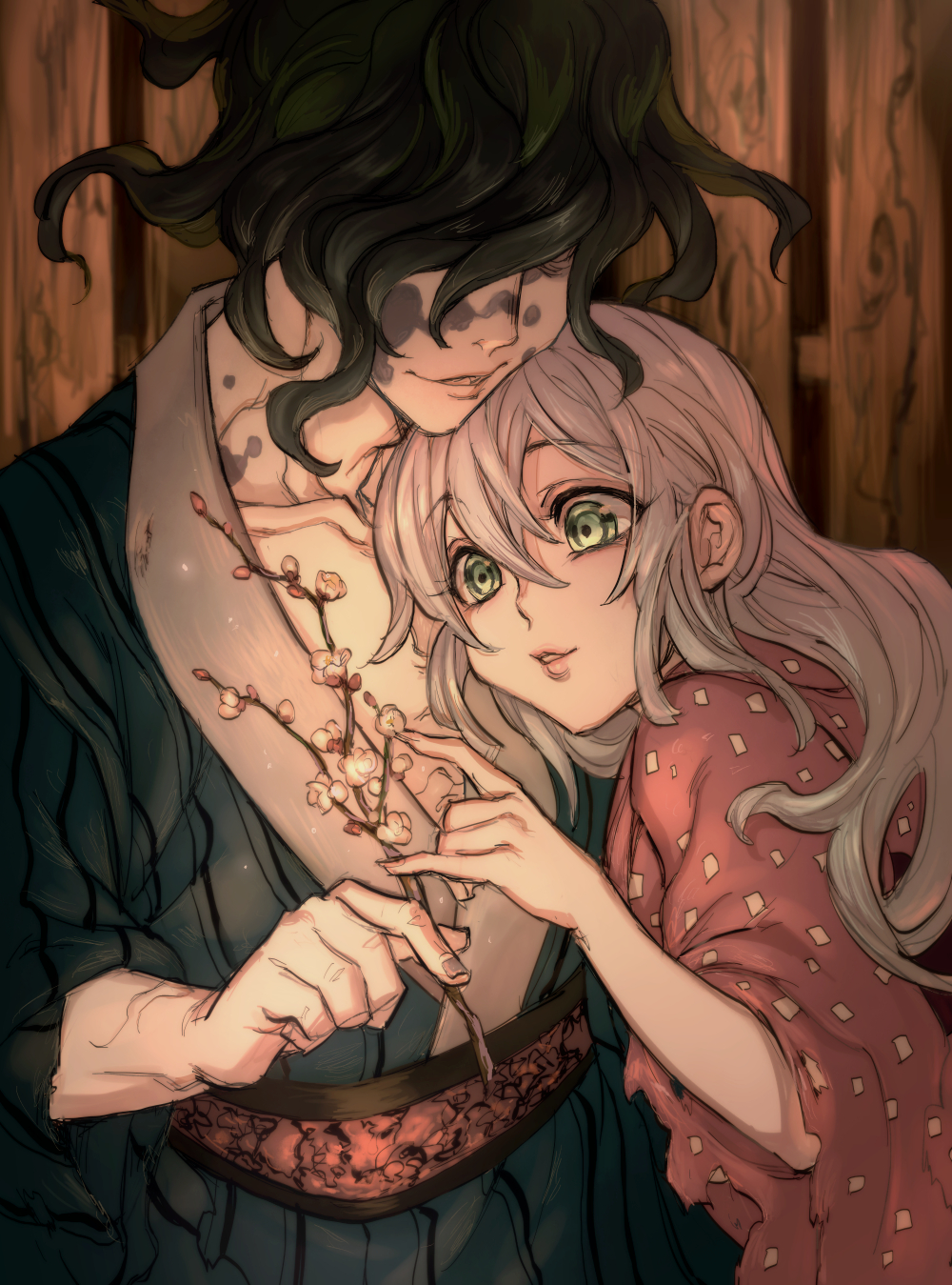 1boy 1girl daki_(kimetsu_no_yaiba) green_eyes green_hair green_kimono gyuutarou_(kimetsu_no_yaiba) highres japanese_clothes kimetsu_no_yaiba kimono long_hair nozoki_davis obi pink_kimono sash siblings smile upper_body wavy_hair white_hair wooden_wall
