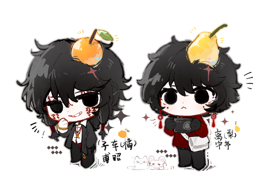 2boys :< animalization bag black_eyes black_gloves black_hair black_jacket black_pants chibi chibi_only chinese_text closed_mouth collared_shirt earrings facial_tattoo food food_on_head fruit fruit_on_head gloves grin hair_between_eyes hand_in_pocket jacket jewelry li_yuting_(male) long_hair long_sleeves male_focus messenger_bag mole mole_under_each_eye mole_under_eye multiple_boys multiple_moles object_on_head open_clothes open_jacket orange_(fruit) pants pear red_jacket shirt short_hair shoulder_bag smile soyuii tattoo touqi_guaitan translation_request white_background white_bag white_shirt ziche_fuzhao