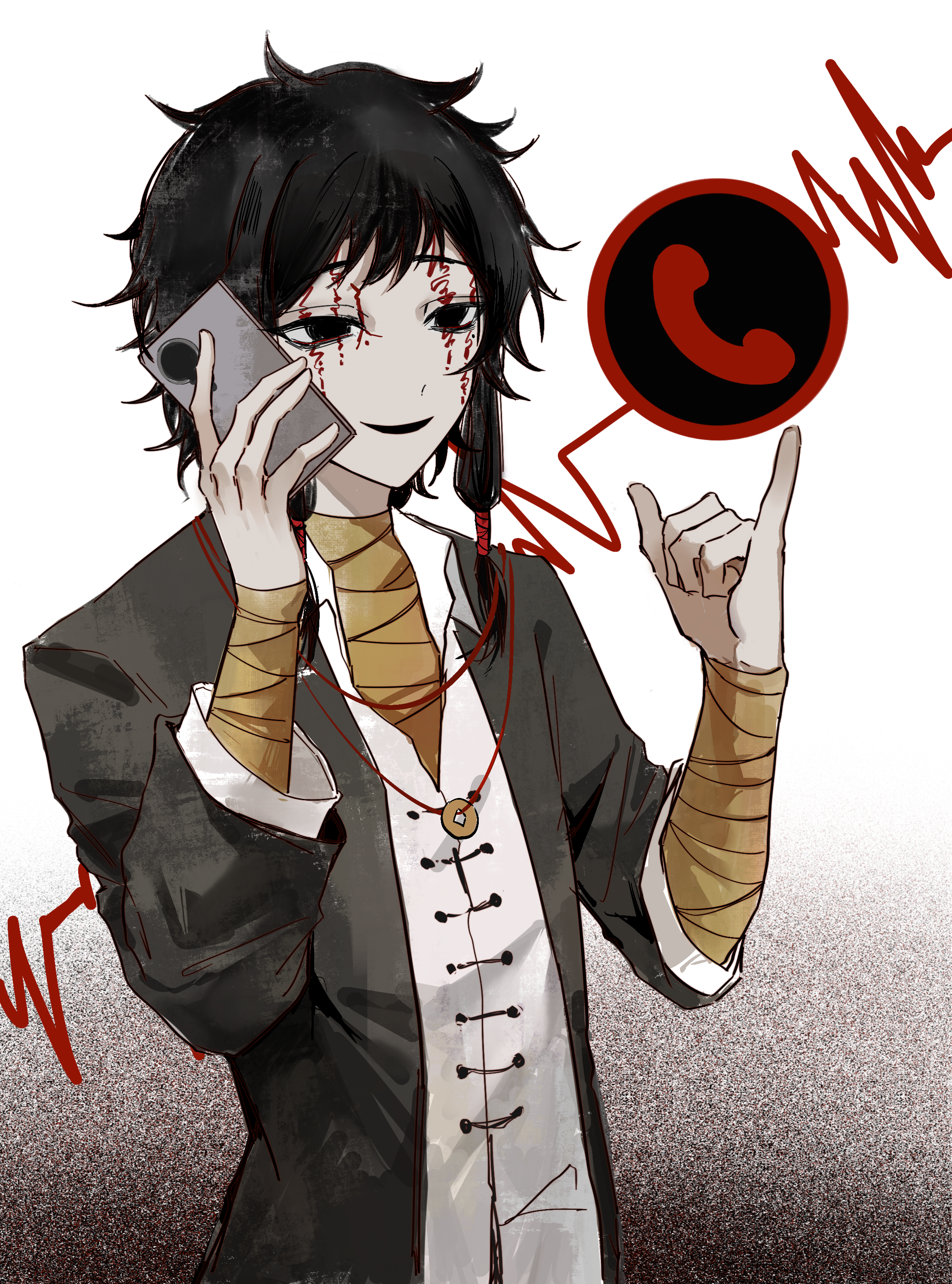 1boy absurdres bandaged_arm bandaged_neck bandages black_eyes black_hair black_jacket cellphone coin coin_on_string collared_shirt facial_tattoo highres holding holding_phone holed_coin jacket jewelry long_sleeves low-tied_sidelocks male_focus necklace niwatari_(xtgydl) open_clothes open_collar open_jacket open_mouth phone shaka_sign shirt short_hair_with_long_locks sidelocks smile solo talking_on_phone tattoo touqi_guaitan upper_body white_shirt ziche_fuzhao