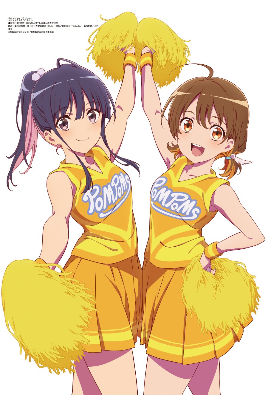 2girls black_eyes black_hair breasts brown_eyes brown_hair cheerleader highres kaionji_megumi long_hair medium_breasts megami_magazine misora_kanata multiple_girls na_nare_hana_nare official_art open_mouth short_hair skirt smile