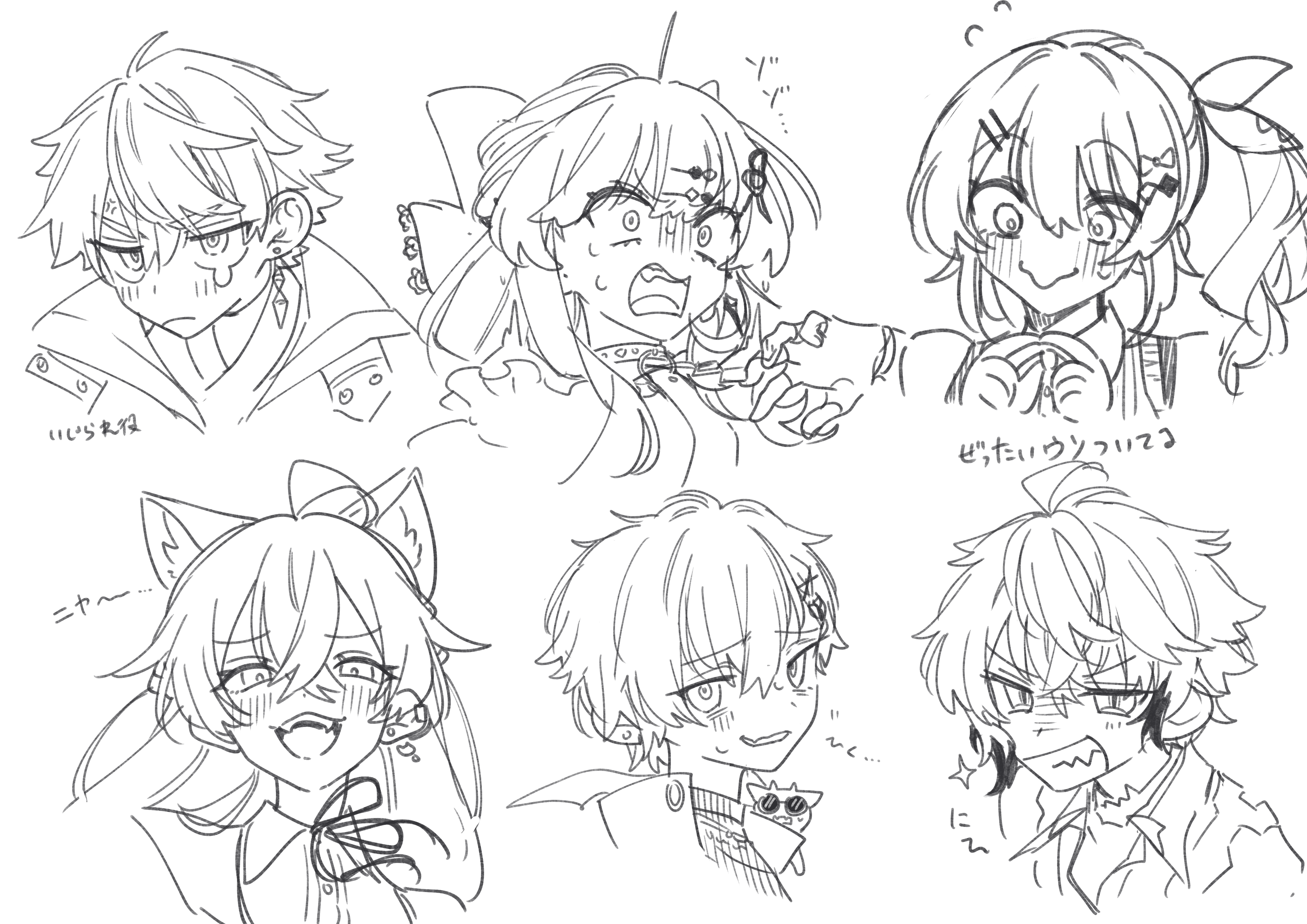 3boys 3girls absurdres ahoge akagi_wen akagi_wen_(1st_costume) animal_ear_fluff animal_ears blush bow cat_ears character_request choker clenched_teeth closed_mouth crossed_bangs earclip earrings fidgeting greyscale hair_bow hair_ornament hairclip half_updo highres ishigami_nozomi ishigami_nozomi_(1st_costume) jewelry kashikaze kitami_yusei kitami_yusei_(1st_costume) koyanagi_rou koyanagi_rou_(2nd_costume) kuramochi_meruto kuramochi_meruto_(1st_costume) long_hair monochrome multiple_boys multiple_girls neck_ribbon nijisanji open_mouth ribbon scared shishido_akari shishido_akari_(casual) short_hair side_ponytail sweatdrop teeth translation_request virtual_youtuber