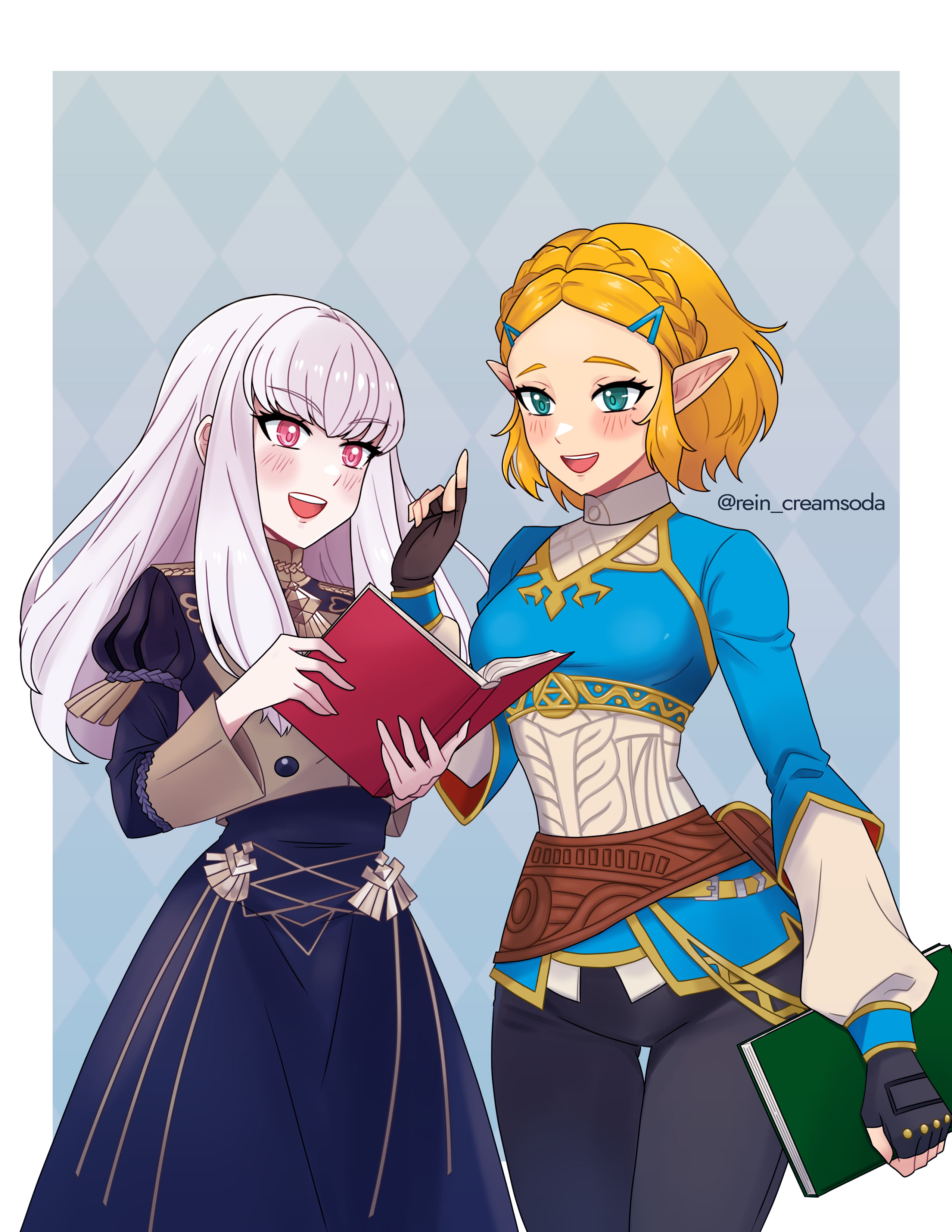 2girls :d absurdres aqua_eyes argyle_background black_gloves black_pants blush book border braid commentary commission crossover crown_braid english_commentary fire_emblem fire_emblem:_three_houses garreg_mach_monastery_uniform gloves gold_trim grey_background highres holding holding_book long_hair lysithea_von_ordelia multiple_girls nintendo open_book open_mouth outside_border pants pointy_ears princess_zelda red_eyes rein_creamsoda short_hair smile teeth the_legend_of_zelda the_legend_of_zelda:_tears_of_the_kingdom upper_teeth_only white_border white_hair