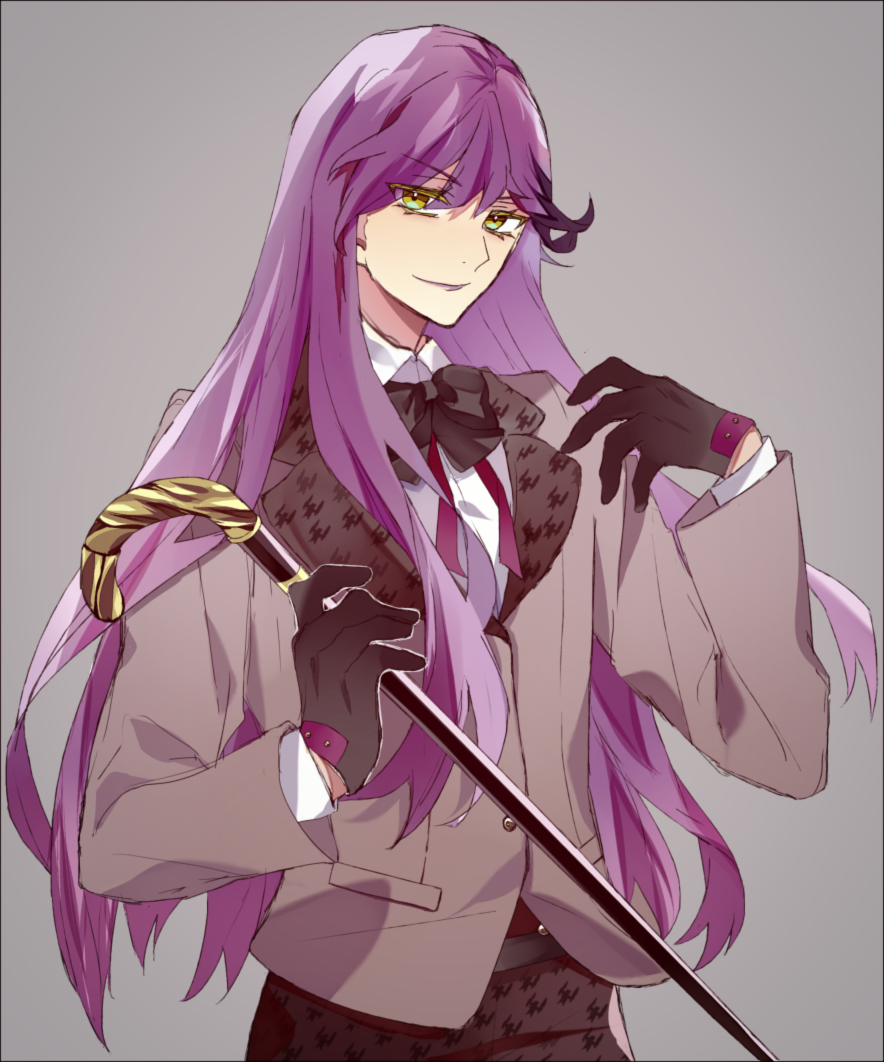 black_gloves cane charade_maniacs commentary_request gloves green_eyes grey_background grey_jacket holding holding_cane iochi_mizuki jacket kiki0001616 lipstick long_hair long_sleeves makeup purple_hair