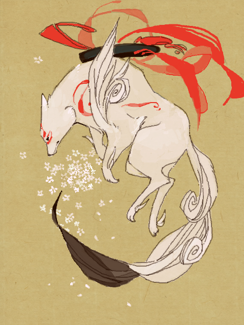 amaterasu_(ookami) animal animal_focus black_eyes bodypaint brown_background closed_mouth facial_mark fire floating flower from_side full_body harukong no_humans ookami_(game) petals solo white_flower white_petals white_wolf wolf