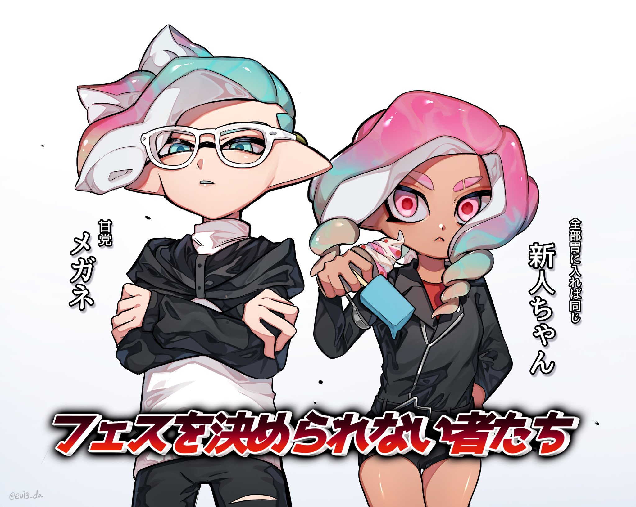 1boy 1girl :< black_hoodie black_jacket black_pants black_shorts blonde_hair blue_eyes blue_hair closed_mouth commentary_request crossed_arms drill_hair ebio(evi3_da) eyebrow_cut floating_hair food glasses gradient_hair hand_on_own_hip highres holding holding_food holding_ice_cream_cone holding_popsicle holding_spoon hood hood_down hoodie ice_cream_cone inkling inkling_boy inkling_player_character jacket long_sleeves medium_hair multicolored_hair nintendo octoling octoling_girl octoling_player_character pants parted_lips pink_eyes pink_hair pointy_ears popsicle red_shirt shirt short_hair shorts simple_background splatoon_(series) splatoon_3 spoon suction_cups thick_eyebrows torn_clothes torn_pants translation_request twin_drills two-tone_hoodie white-framed_eyewear white_background white_hoodie