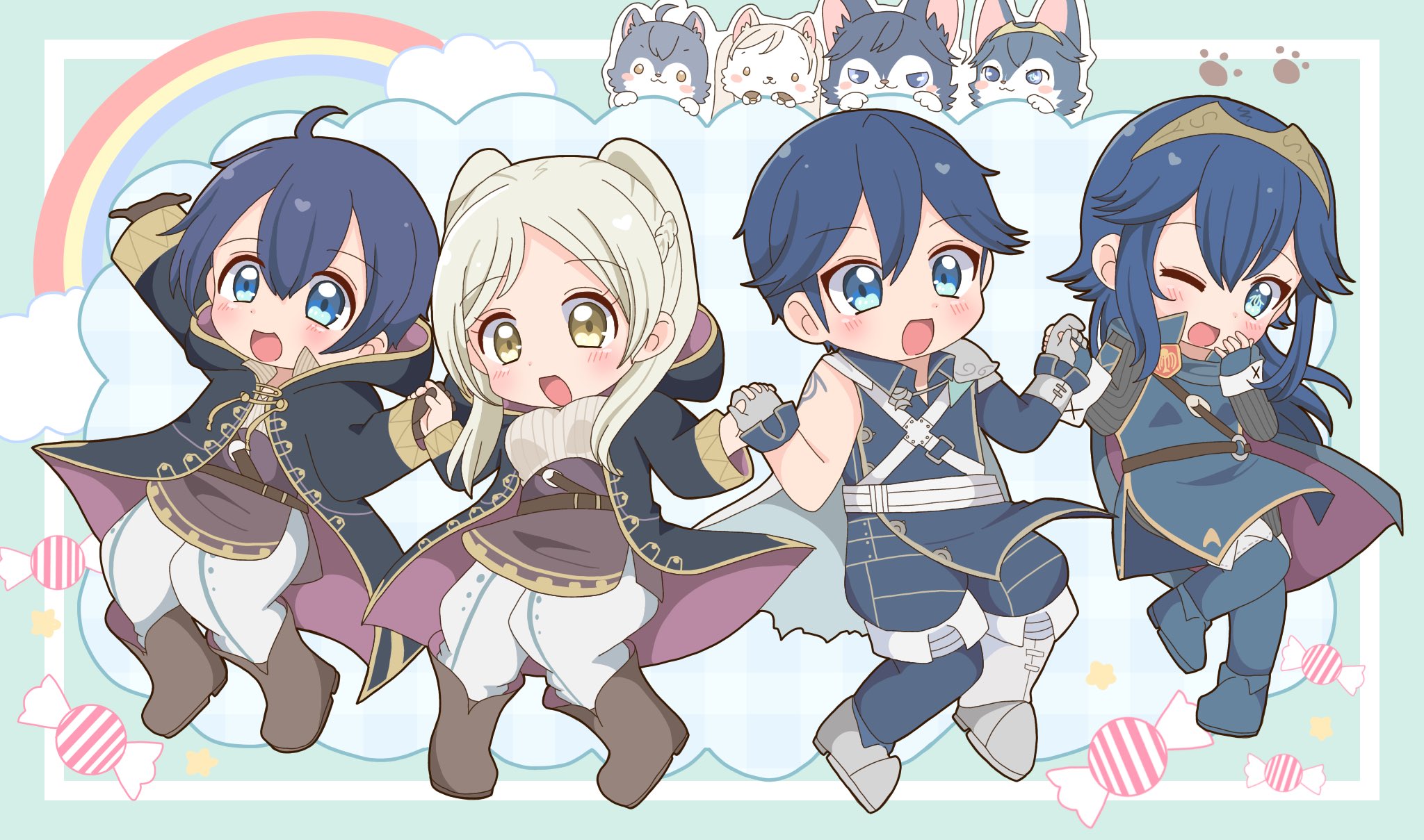 2boys 2girls :d ahoge animalization aqua_background arm_up belt black_robe blue_cape blue_eyes blue_footwear blue_hair blush boots brown_footwear brown_gloves cape chibi chibi_only chrom_(fire_emblem) cloud commentary father_and_child father_and_daughter female_morgan_(fire_emblem) female_robin_(fire_emblem) fire_emblem fire_emblem_awakening gloves gold_trim highres holding_hands inset_border lucina_(fire_emblem) male_morgan_(fire_emblem) multiple_boys multiple_girls nintendo one_eye_closed open_mouth parent_and_child rainbow red_cape robe rukinya_nya short_hair smile tiara twintails two-sided_cape two-sided_fabric two-tone_cape untranslatable_commentary white_hair wolf yellow_eyes