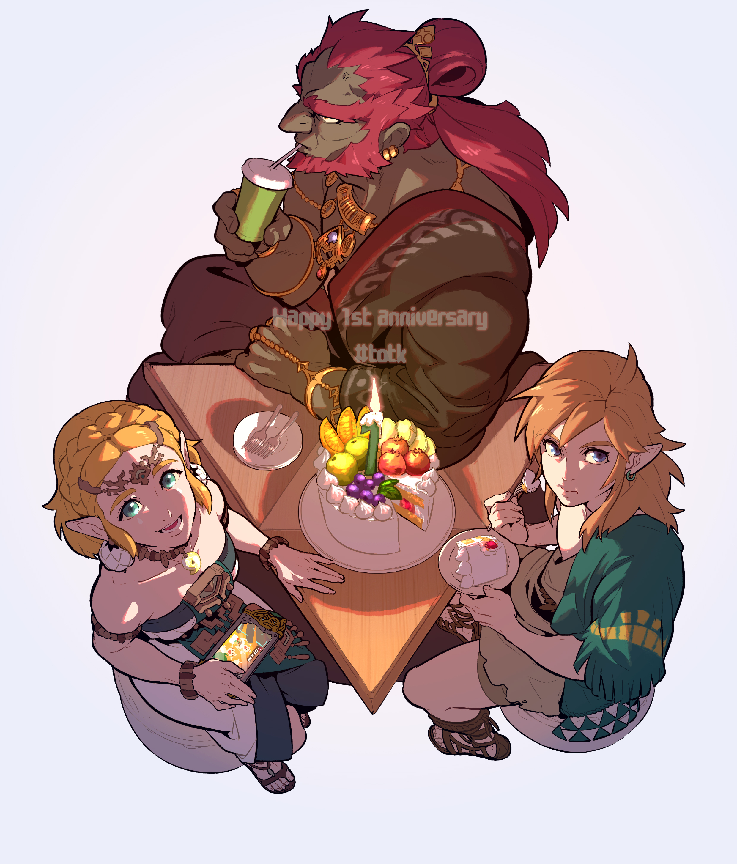 1girl 2boys absurdres anger_vein arm_on_table arm_up armband beard blonde_hair blue_eyes bracelet braid brown_pants brown_tunic cake cake_slice chewing commentary crossed_legs crown_braid cup dark-skinned_male dark_skin disposable_cup dress drink drinking_straw drinking_straw_in_mouth earrings english_text facial_hair food fork fruit ganondorf gladiator_sandals green_eyes hair_intakes hand_on_table happy_anniversary highres holding holding_drink holding_fork holding_plate jewelry link long_hair looking_ahead looking_to_the_side looking_up magatama multicolored_clothes multiple_boys multiple_earrings muscular muscular_male necklace nintendo open_mouth pants plate pointy_ears princess_zelda red_hair redlhzz rehydrated_ganondorf sandals sheikah_slate sideways_glance simple_background single_bare_shoulder sitting sleeveless sleeveless_dress smile table the_legend_of_zelda the_legend_of_zelda:_tears_of_the_kingdom thick_eyebrows triforce tunic veins white_background white_dress