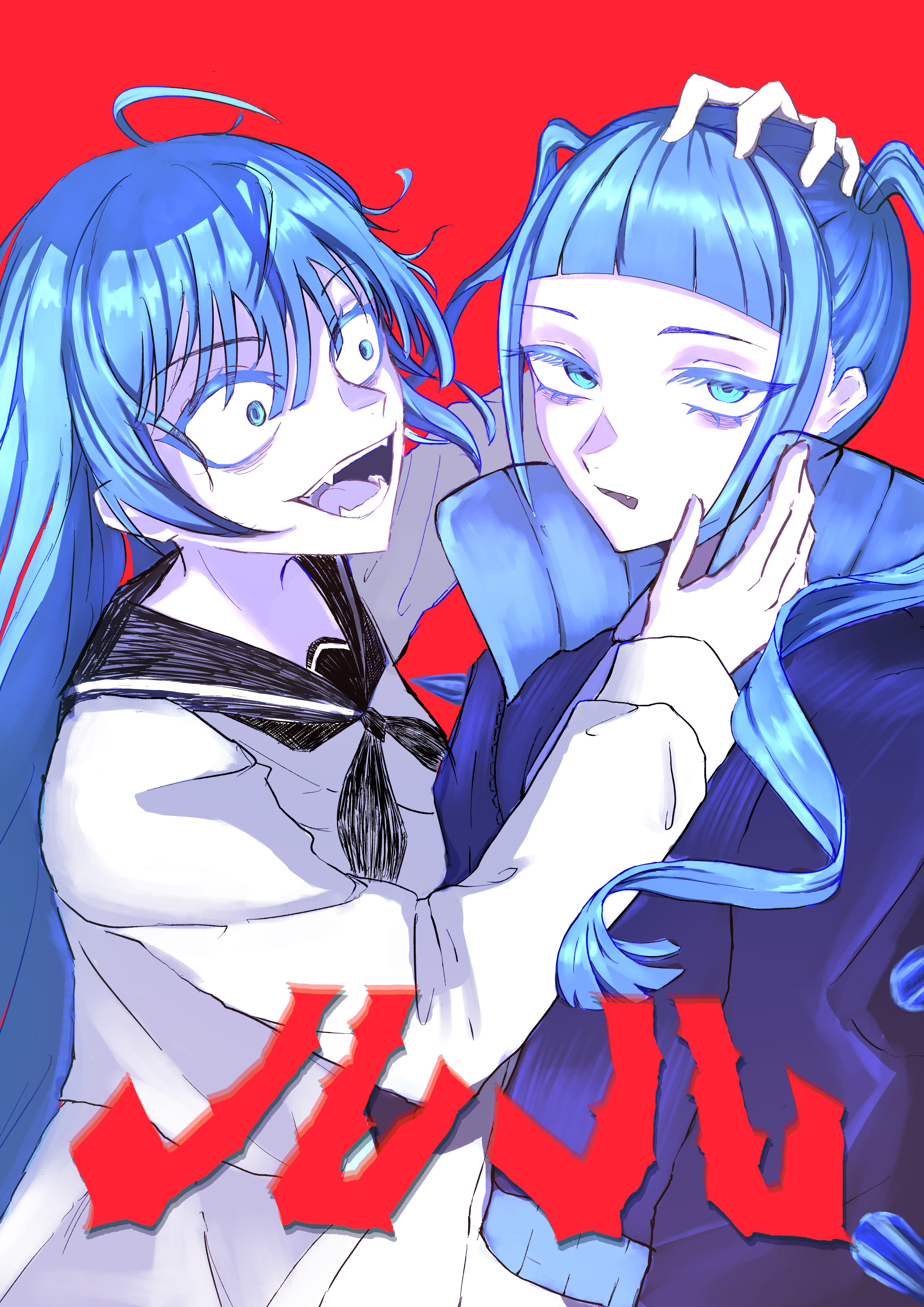 2girls absurdres ado_(utaite) ahoge black_neckerchief black_sailor_collar blue_eyes blue_hair blue_jacket commentary_request fang fangs highres jacket long_hair long_sleeves multiple_girls neckerchief open_mouth red_background rule-chan_(ado) rule_(ado) sailor_collar school_uniform serafuku shirt sidelocks sido_(sido_mrtsnkc) simple_background song_name twintails white_shirt
