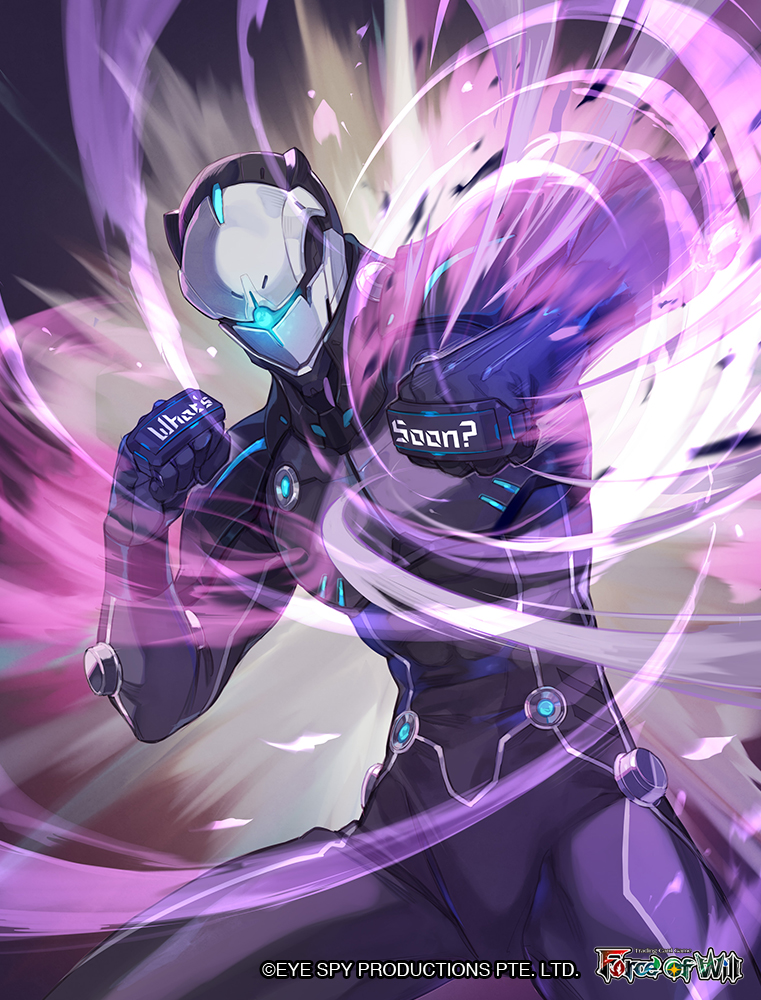 1boy black_bodysuit bodysuit character_request cowboy_shot english_text facing_viewer force_of_will glowing helm helmet male_focus official_art solo yuko_(uc_yuk)