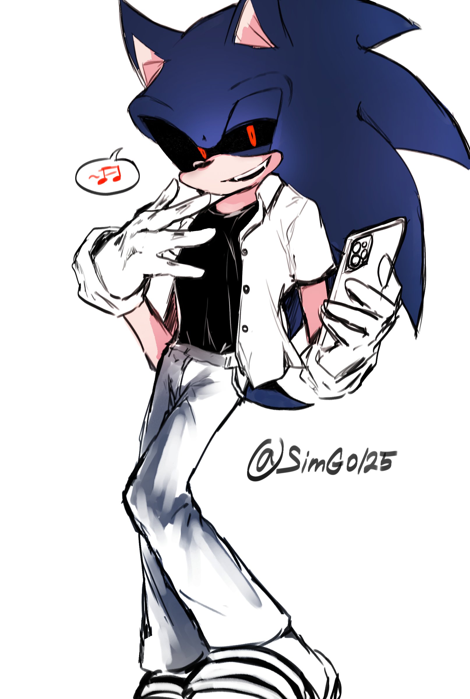 1boy absurdres alternate_costume animal_ears animal_nose artist_name black_sclera black_shirt blue_fur blue_hair body_fur buttons cellphone collared_shirt colored_sclera fangs furry furry_male gloves half-closed_eye hands_up happy highres holding holding_phone iphone korean_clothes long_hair looking_at_viewer male_focus musical_note open_clothes open_mouth open_shirt pants phone pocket red_eyes school_uniform shapam_(zeepgalae) shirt shirt_tucked_in shoes short_sleeves signature sketch smartphone smile solo sonic.exe sonic.exe_(character) sonic_(series) speech_bubble spiked_hair spoken_musical_note teeth twitter_username undershirt uneven_eyes unfinished white_gloves white_pants white_shirt white_shoes