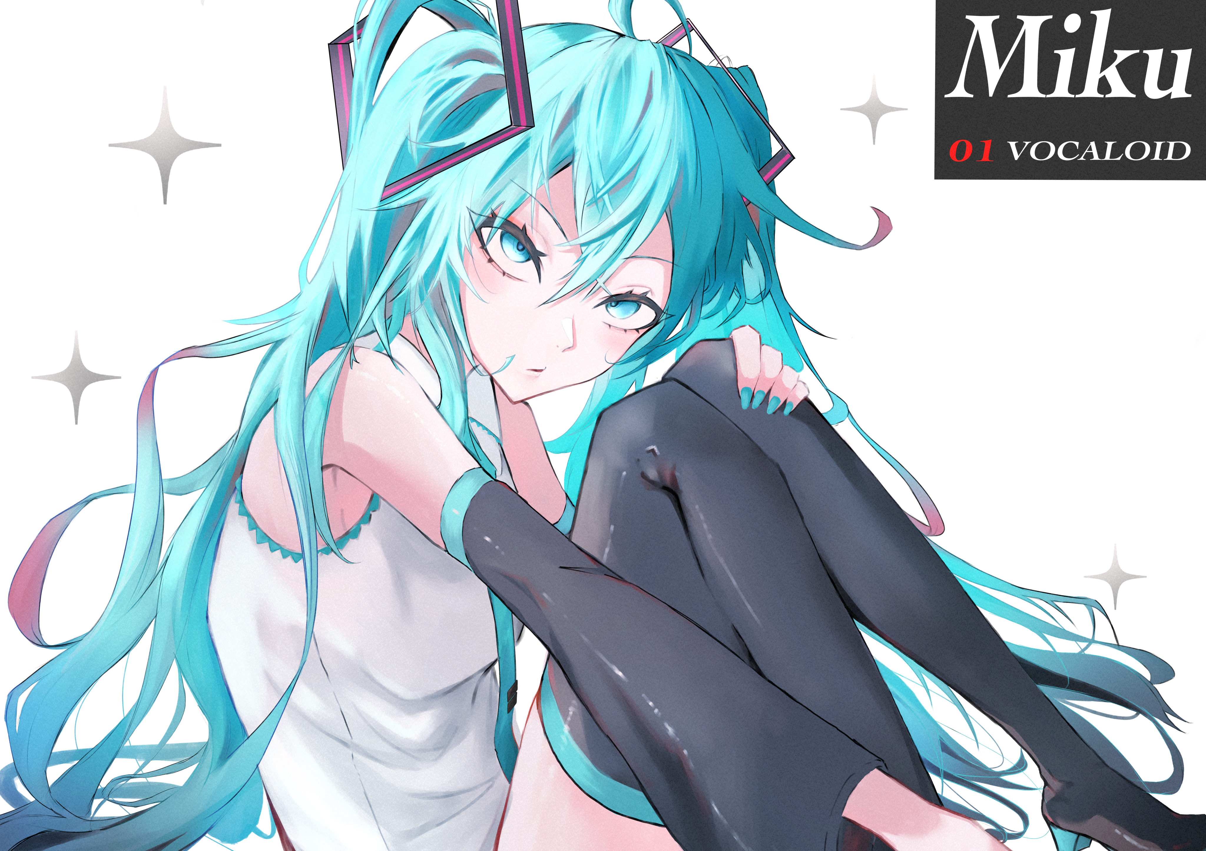 1girl absurdres aqua_eyes aqua_hair aqua_nails aqua_necktie black_thighhighs character_name commentary_request copyright_name detached_sleeves hair_between_eyes hatsune_miku highres long_hair nail_polish necktie no_shoes parted_lips shirt sido_(sido_mrtsnkc) sitting sleeveless sleeveless_shirt solo sparkle thighhighs tie_clip twintails very_long_hair vocaloid white_background white_shirt wide_sleeves