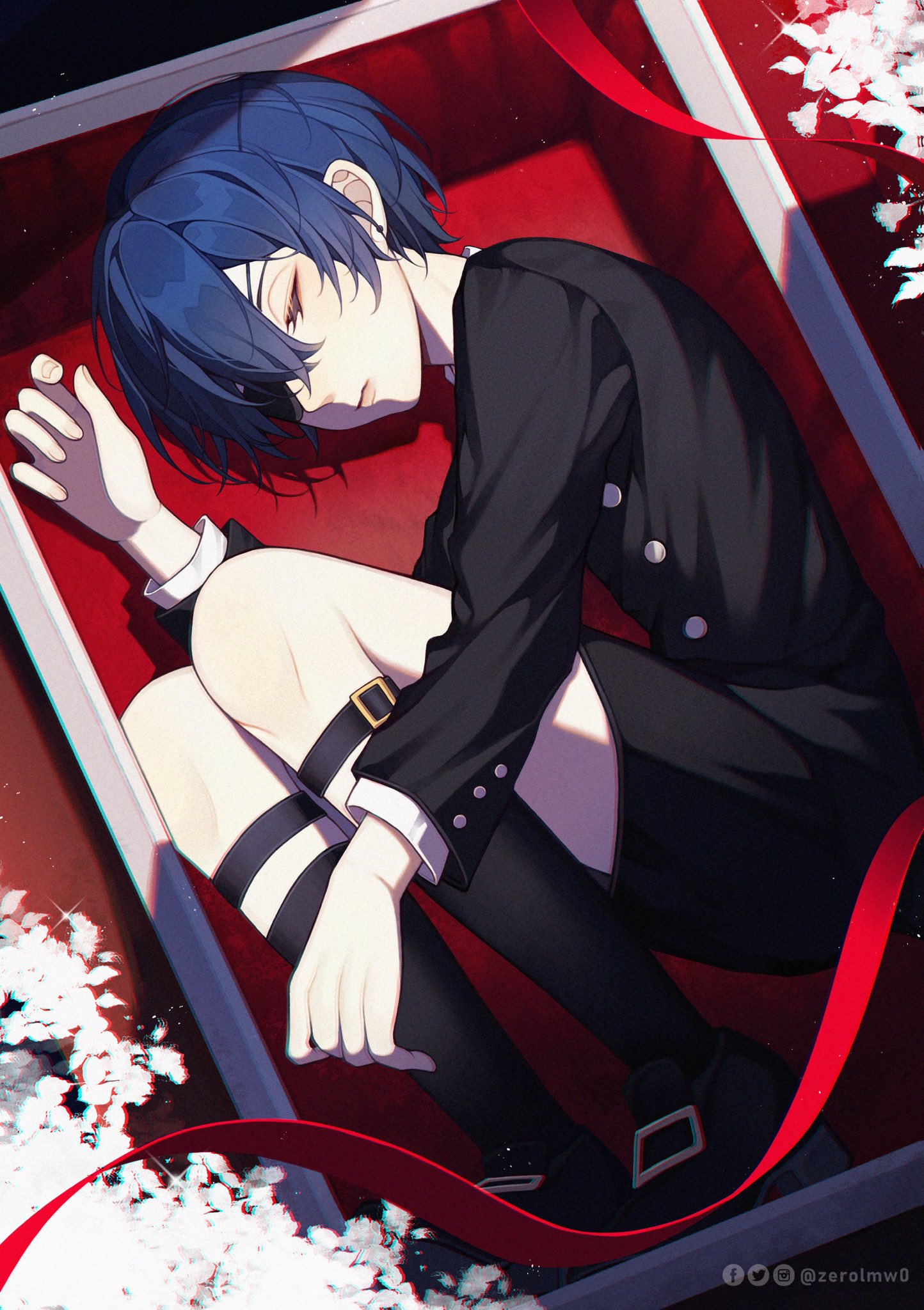 1boy artist_name black_footwear black_jacket black_shorts black_socks blue_hair buttons ciel_phantomhive closed_eyes closed_mouth dark_blue_hair earrings eyepatch facebook_logo fetal_position flower highres instagram_logo jacket jewelry kuroshitsuji male_focus red_ribbon ribbon short_hair shorts socks solo thigh_strap twitter_logo white_flower zerolmw0