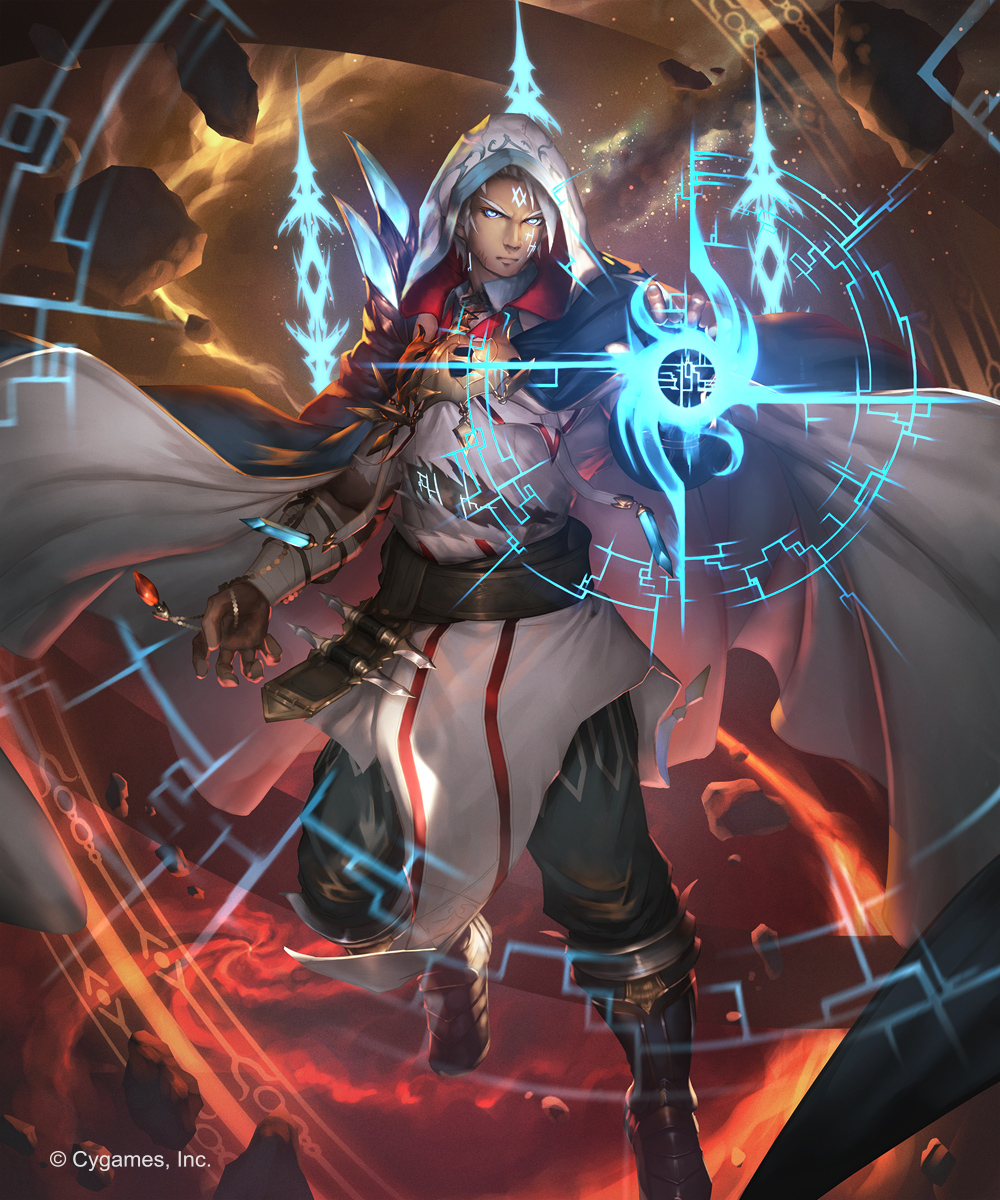 1boy armor black_cape black_pants blue_eyes boots brown_gloves cape cloak cloud commentary_request crystal dark_skin facial_mark fingerless_gloves floating floating_rock full_body gloves glowing glowing_eyes highres hood hood_up hooded_cloak jewelry kazashino_miyabi knee_boots magic official_art pants shadowverse shoulder_armor single_fingerless_glove smoke standing watermark white_cloak white_hair wing_collar yuwan_(shadowverse)