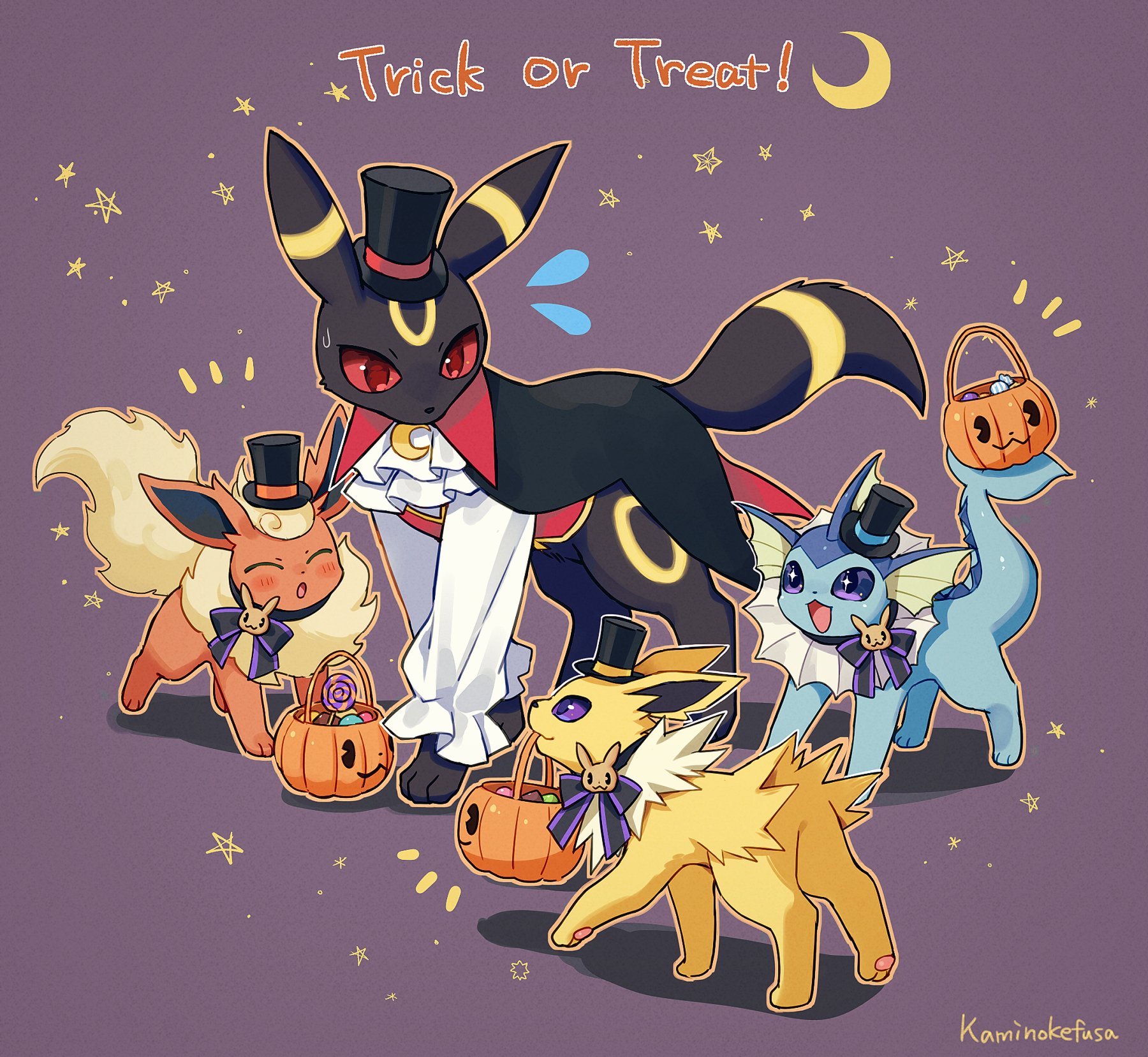 animal animal_focus blush candy colored_sclera fins flareon flareon_(halloween) food gen_1_pokemon gen_2_pokemon halloween halloween_bucket halloween_costume hat highres jolteon jolteon_(halloween) kaminokefusa mouth_hold nintendo open_mouth pokemon pokemon_(creature) pokemon_cafe_remix purple_eyes red_eyes red_sclera smile top_hat umbreon umbreon_(halloween) vaporeon vaporeon_(halloween)