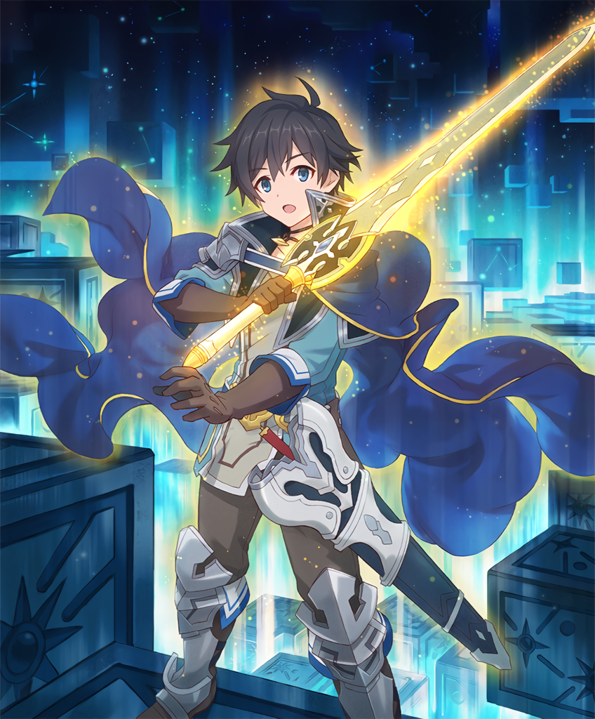 1boy armor armored_boots aura belt black_hair blue_cape blue_eyes blue_shirt boots brown_gloves brown_pants cape collarbone cube ezusuke feet_out_of_frame floating gloves glowing glowing_sword glowing_weapon hair_between_eyes holding holding_sword holding_weapon jewelry knee_boots light_particles magic official_art open_mouth pants princess_connect! scabbard shadowverse sheath shirt shoulder_armor solo standing sword weapon yuuki_(princess_connect!)