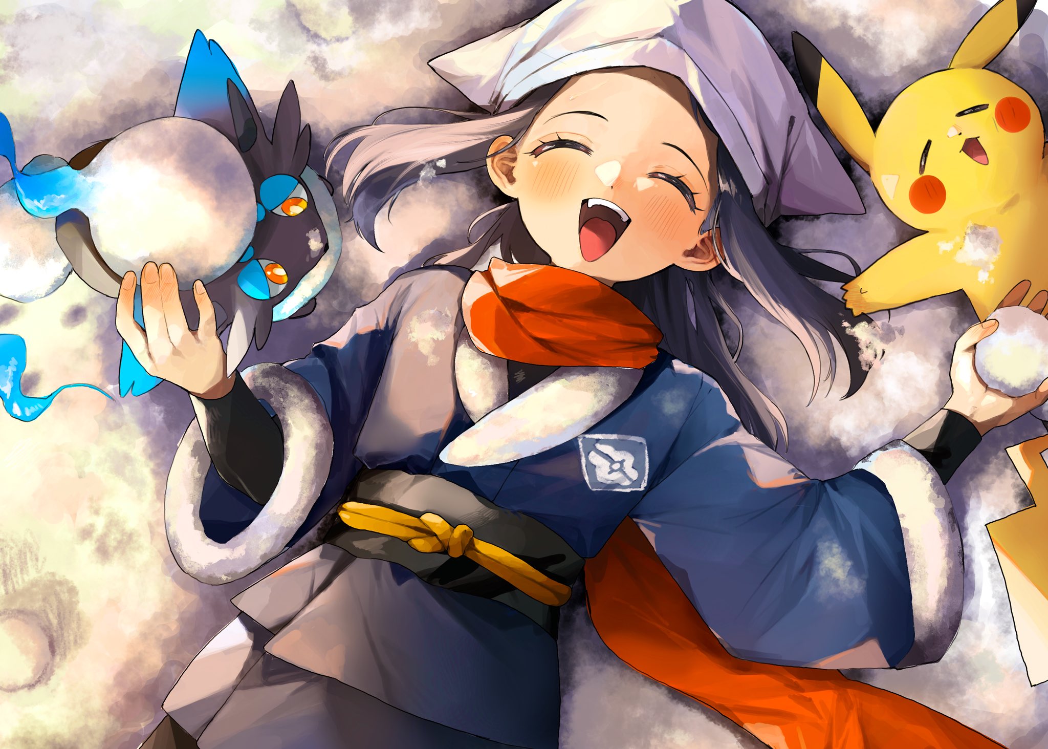 1girl :d ^_^ akari_(pokemon) alternate_color black_hair black_pantyhose black_sash blue_jacket blue_skirt closed_eyes fukuzawa_(huku486) galaxy_expedition_team_survey_corps_uniform gen_1_pokemon headscarf highres hisuian_zorua holding holding_snowball jacket long_hair lying miniskirt nintendo on_back open_mouth pantyhose pikachu pokemon pokemon_(creature) pokemon_legends:_arceus red_scarf sash scarf shiny_pokemon skirt smile snow snowball teeth upper_teeth_only white_headscarf