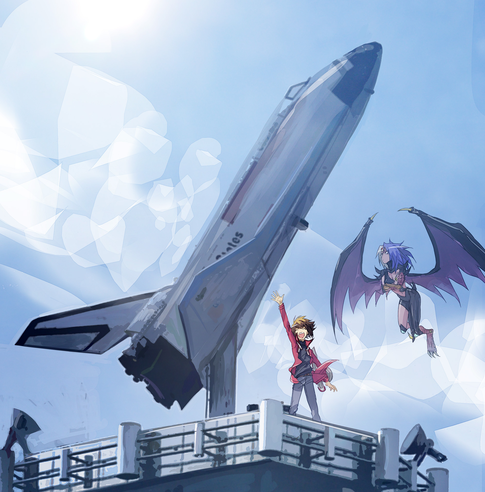 1boy 1other arm_up black_shirt blue_sky building clear_sky closed_eyes crossed_arms demon_wings duel_disk duel_monster facing_to_the_side facing_viewer grey_pants highres jacket light_rays looking_at_object looking_at_viewer moribuden multicolored_hair on_roof on_rooftop open_clothes open_jacket open_mouth outdoors pants red_jacket shirt sky spacecraft waving wings yu-gi-oh! yu-gi-oh!_gx yubel yuki_judai