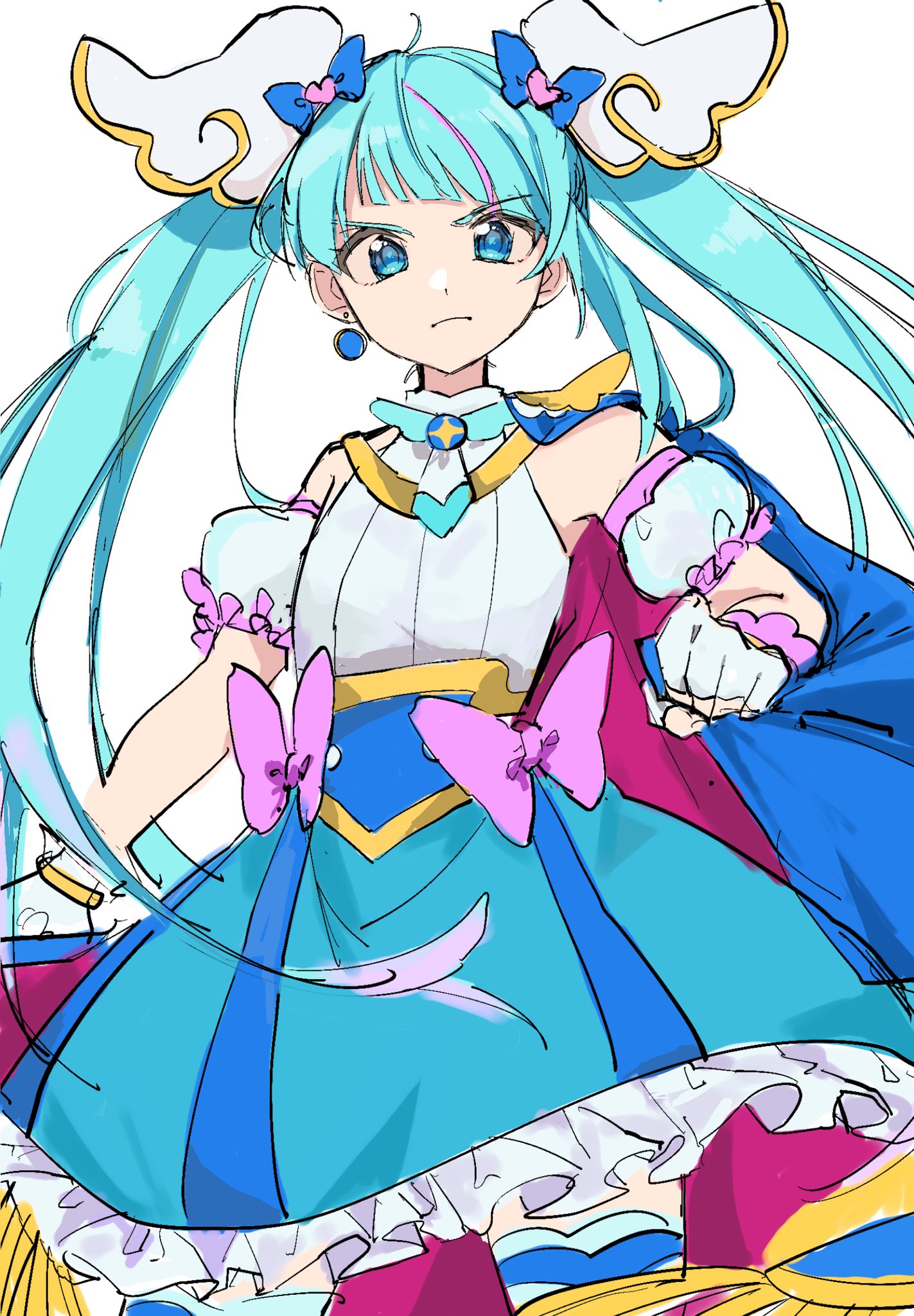 >:( 1girl ahoge blue_cape blue_eyes blue_hair blue_skirt bow skirt_bow cape cape_lift clenched_hand closed_mouth cowboy_shot cure_sky detached_sleeves earrings fingerless_gloves frilled_skirt frills frown fukuzawa_(huku486) gloves heart highres hirogaru_sky!_precure jewelry lifting_own_clothes light_blue_hair long_hair looking_at_viewer magical_girl multicolored_hair pink_bow pink_cape pink_hair precure puffy_short_sleeves puffy_sleeves shirt short_sleeves simple_background single_earring skirt solo sora_harewataru streaked_hair thighhighs twintails two-sided_cape two-sided_fabric two-tone_cape v-shaped_eyebrows very_long_hair white_background white_shirt white_sleeves zettai_ryouiki