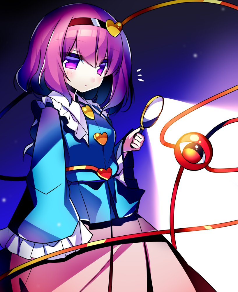 1girl black_hairband blue_shirt buttons closed_mouth eyeball frilled_sleeves frills hair_ornament hairband heart heart_button heart_hair_ornament komeiji_satori kujou_mikuru long_sleeves looking_at_viewer pink_eyes pink_hair pink_skirt shirt skirt smile solo third_eye touhou wide_sleeves
