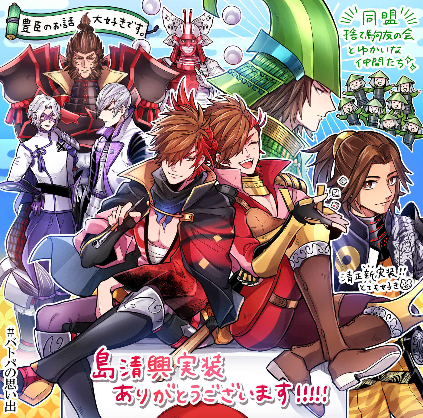 6+boys :d armor black_sclera brown_hair colored_sclera dice dual_persona eye_mask frown green_eyes green_helmet grey_hair hair_over_one_eye helmet highres holding holding_smoking_pipe ishida_mitsunari_(sengoku_basara) japanese_armor jinbaori kabuto_(helmet) katou_kiyomasa_(sengoku_basara) kkkaaaayyy looking_at_another looking_at_viewer male_focus mask midriff_sarashi mouri_motonari_(sengoku_basara) multiple_boys ootani_yoshitsugu_(sengoku_basara) open_mouth pectoral_cleavage pectorals purple_eyes purple_mask red_eyes red_hair sarashi sengoku_basara shima_kiyooki_(sengoku_basara) shima_sakon_(sengoku_basara) short_hair shoulder_armor sitting smile smoking_pipe takenaka_hanbee_(sengoku_basara) toyotomi_hideyoshi_(sengoku_basara) white_eyes white_hair