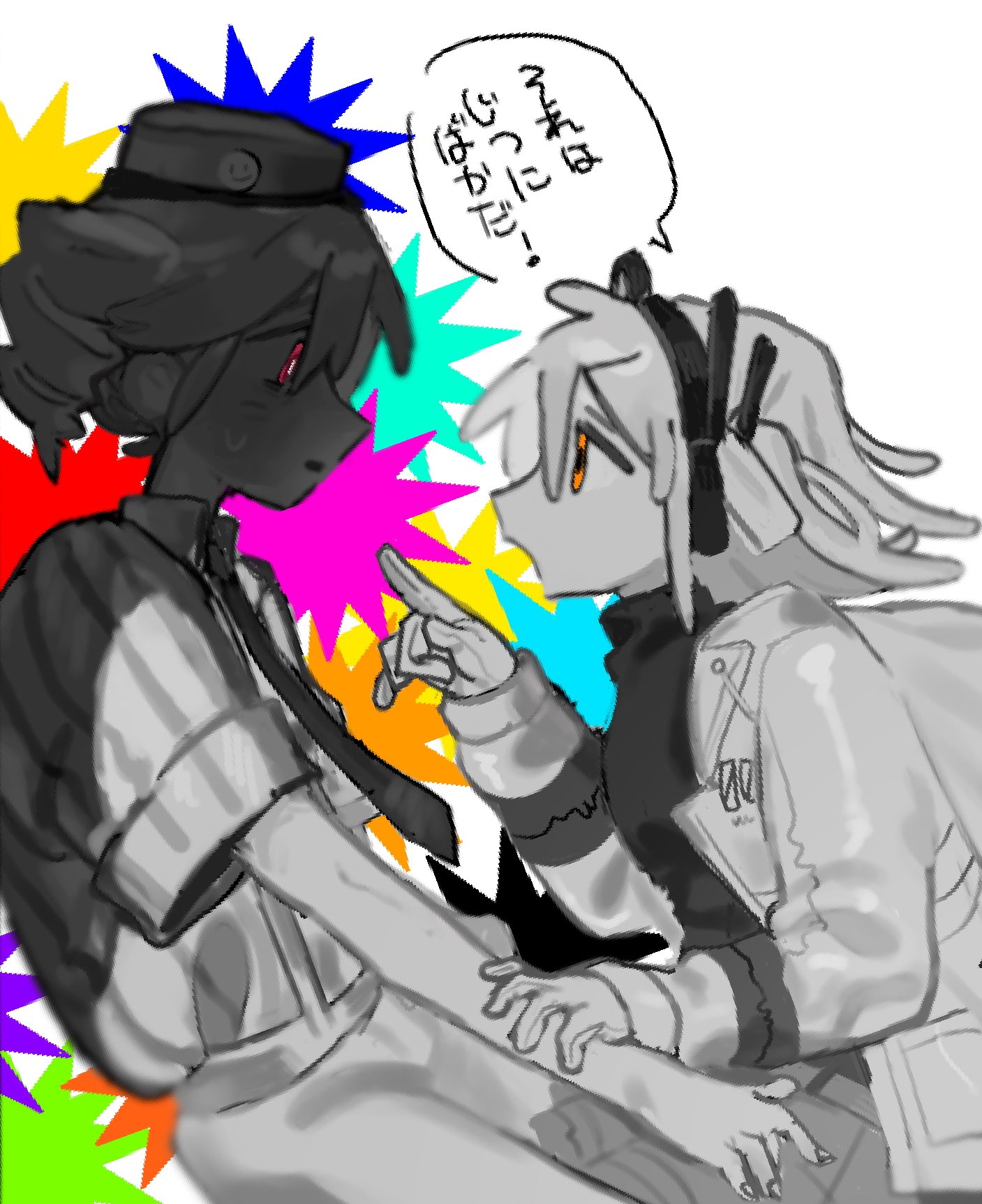 2girls a.i._voice adachi_rei alternate_costume ayapu_gogo commentary_request cowboy_shot drill_hair eye_contact face-to-face gloves hand_up highres holding_another's_wrist hood hood_down hooded_jacket jacket kasane_teto long_sleeves looking_at_another mesmerizer_(vocaloid) multiple_girls necktie open_clothes open_jacket open_mouth orange_eyes pants partially_colored pillbox_hat pinstripe_pattern pinstripe_shirt pointing pointing_at_another profile radio_antenna red_eyes shadow shirt short_hair short_sleeves simple_background skirt small_sweatdrop speech_bubble star_(symbol) suspenders translation_request turtleneck turtleneck_shirt twin_drills utau white_background