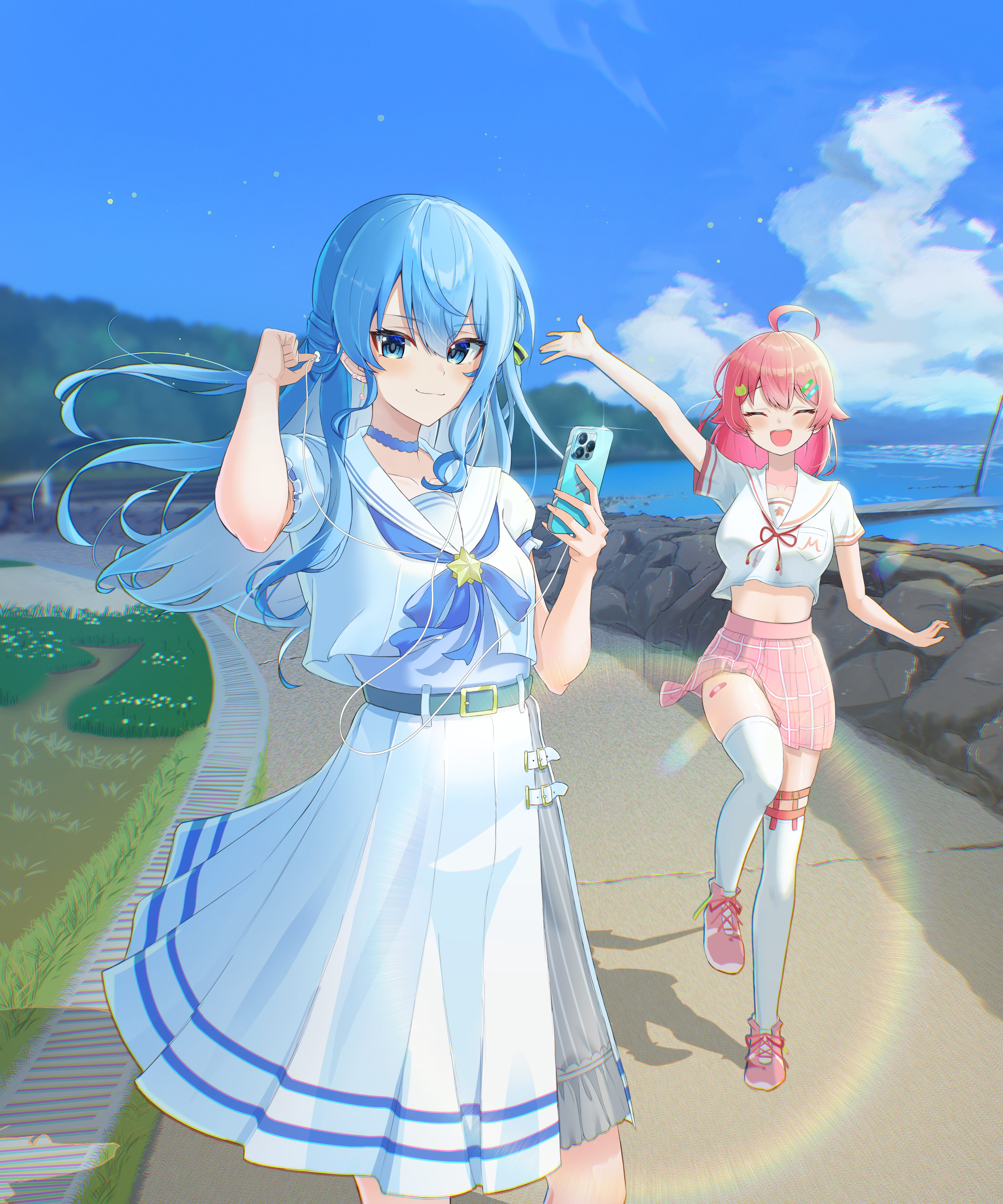 2girls absurdres belt blue_bow blue_bowtie blue_choker blue_eyes blue_hair blue_sky bow bowtie brooch cat_hair_ornament cellphone choker closed_eyes closed_mouth cloud commentary cowboy_shot day dress english_commentary facing_viewer full_body hair_ornament hairclip highres holding holding_phone hololive hoshimachi_suisei hoshimachi_suisei_(sailor) jewelry kamkampan lens_flare long_hair looking_at_viewer medium_hair miniskirt multiple_girls neck_ribbon ocean official_alternate_costume official_alternate_hair_length official_alternate_hairstyle open_mouth outdoors phone pink_hair pink_skirt plaid_clothes plaid_skirt pleated_skirt puffy_short_sleeves puffy_sleeves red_ribbon ribbon sailor_collar sailor_dress sakura_miko sakura_miko_(school_uniform) school_uniform shirt short_sleeves skirt sky smartphone smile standing standing_on_one_leg star_(symbol) star_brooch star_in_eye symbol_in_eye thigh_strap thighhighs virtual_youtuber white_dress white_sailor_collar white_shirt white_thighhighs