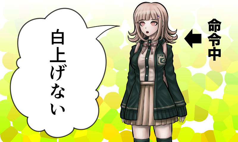 1girl :o backpack bag black_jacket black_shirt black_thighhighs blunt_bangs brown_eyes brown_hair brown_skirt collared_shirt cowboy_shot danganronpa_(series) danganronpa_2:_goodbye_despair dress_shirt gig_(artist) hair_ornament jacket medium_hair miniskirt multicolored_background nanami_chiaki necktie open_clothes open_jacket pink_bag pink_necktie pleated_skirt shirt skirt solo teeth thighhighs translation_request two-tone_shirt upper_teeth_only white_shirt yellow_background zettai_ryouiki