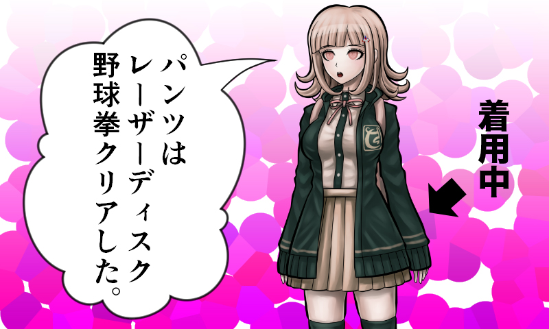 1girl :o backpack bag black_jacket black_shirt black_thighhighs blunt_bangs brown_eyes brown_hair brown_skirt collared_shirt cowboy_shot danganronpa_(series) danganronpa_2:_goodbye_despair dress_shirt gig_(artist) hair_ornament jacket medium_hair miniskirt multicolored_background nanami_chiaki necktie open_clothes open_jacket pink_background pink_bag pink_necktie pleated_skirt shirt skirt solo teeth thighhighs translation_request two-tone_shirt upper_teeth_only white_shirt zettai_ryouiki