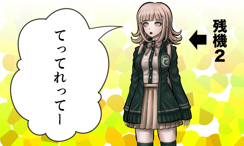 1girl :o backpack bag black_jacket black_shirt black_thighhighs blunt_bangs brown_eyes brown_hair brown_skirt collared_shirt cowboy_shot danganronpa_(series) danganronpa_2:_goodbye_despair dress_shirt gig_(artist) hair_ornament jacket medium_hair miniskirt multicolored_background nanami_chiaki necktie open_clothes open_jacket pink_bag pink_necktie pleated_skirt shirt skirt solo teeth thighhighs translation_request two-tone_shirt upper_teeth_only white_shirt yellow_background zettai_ryouiki
