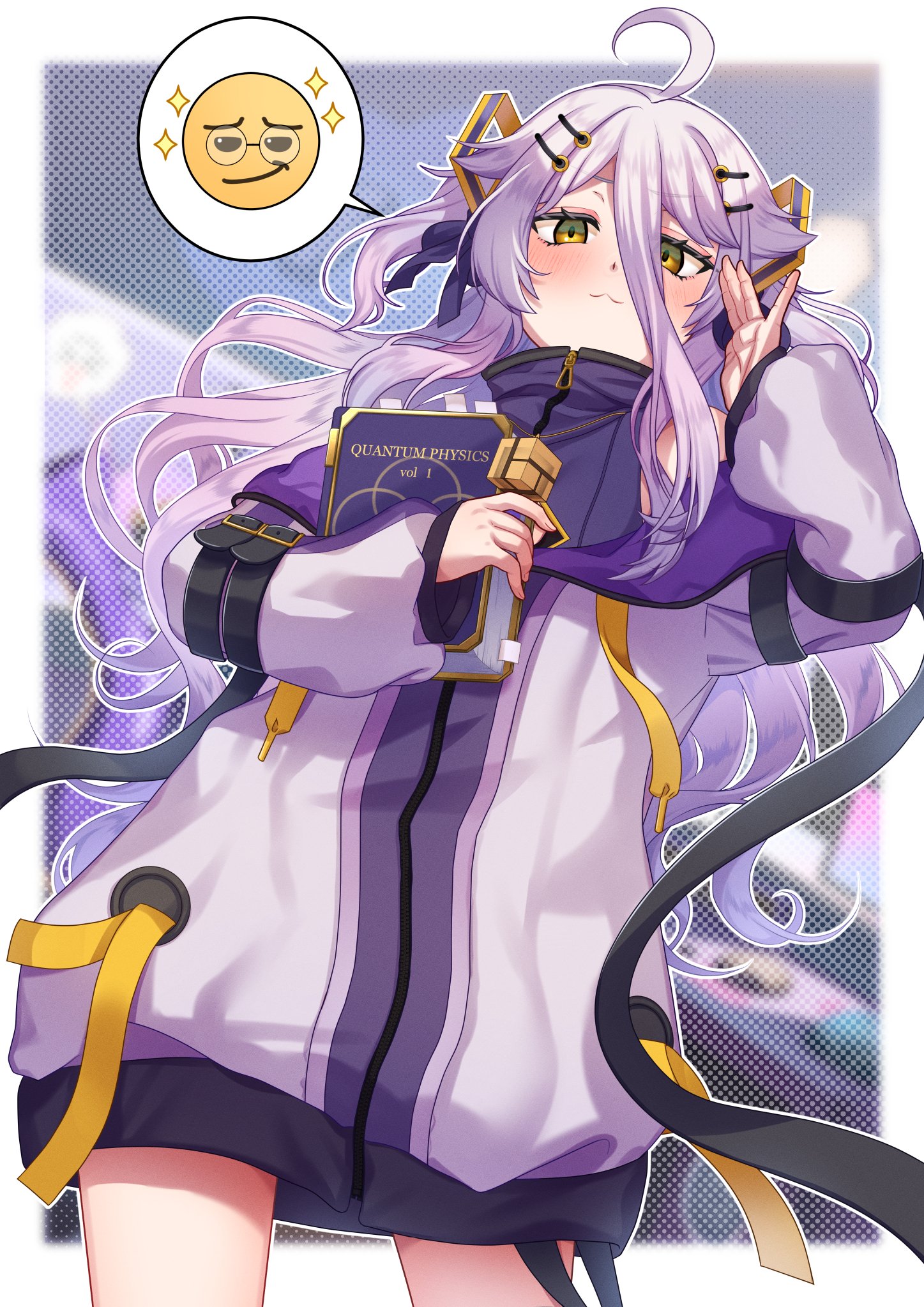 1girl :3 adjusting_eyewear ahoge arm_belt belt black-framed_eyewear black_belt blush book dress emoji glasses gradient_hair grey_hair hair_between_eyes hair_ornament hair_ribbon hairclip henya_the_genius henya_the_genius_(1st_costume) highres holding holding_book jacket long_bangs long_hair looking_at_viewer multicolored_hair multicolored_jacket partially_unzipped purple_dress purple_hair purple_jacket purple_ribbon ribbon round_eyewear sidelocks smug solo spoken_emoji two_side_up ursn_e virtual_youtuber vshojo yellow_eyes zipper