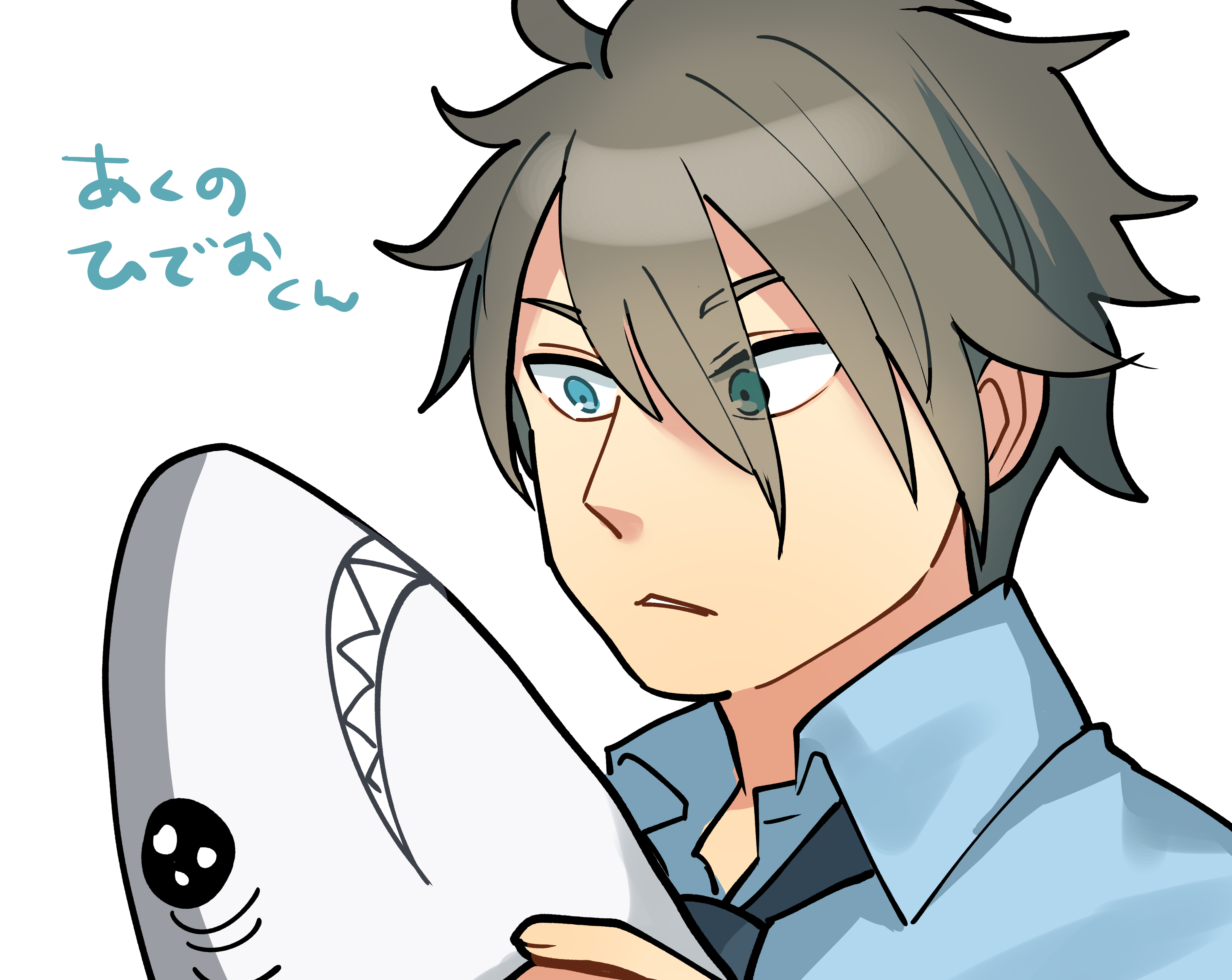1boy absurdres akuno_hideo blue_eyes blue_necktie blue_shirt collared_shirt grey_hair hair_between_eyes highres holding holding_stuffed_toy idolmaster idolmaster_side-m kinakotatu long_bangs male_focus necktie parted_lips shirt simple_background solo stuffed_animal stuffed_shark stuffed_toy translation_request white_background