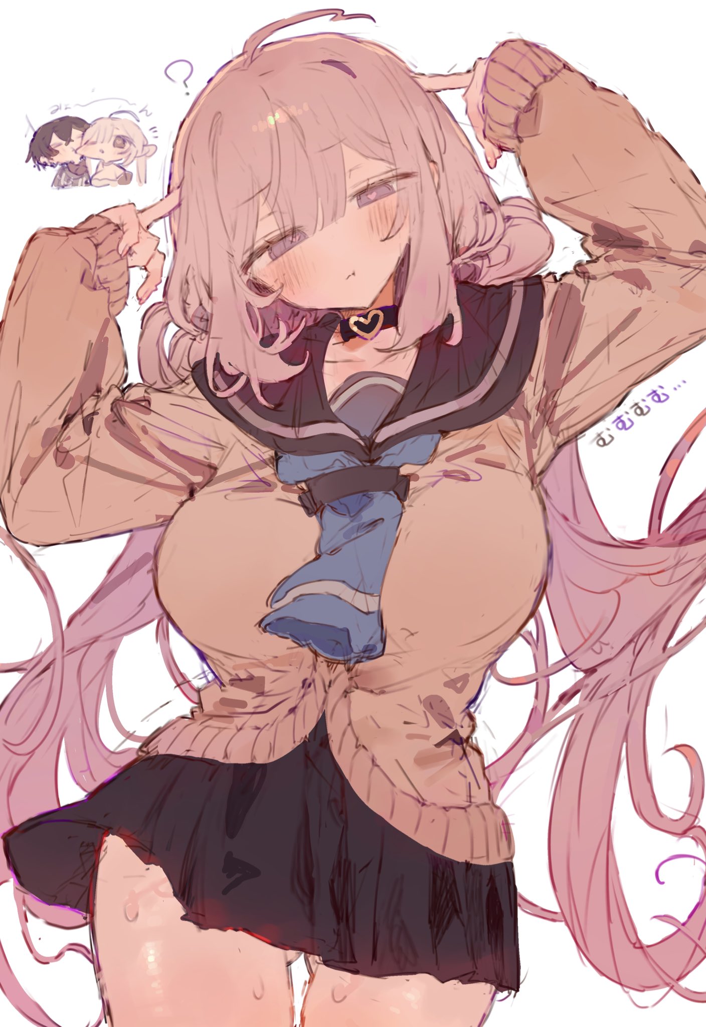 1boy 1girl ? ahoge black_choker black_hair black_sailor_collar black_skirt blue_neckerchief blush breasts bunchi choker closed_mouth commission cowboy_shot gluteal_fold grey_eyes grey_hair grey_serafuku hands_up head_tilt heart heart-shaped_pupils heart_choker highres large_breasts long_hair multiple_views neckerchief one_eye_closed original sailor_collar school_uniform serafuku simple_background skeb_commission skirt sweat symbol-shaped_pupils white_background