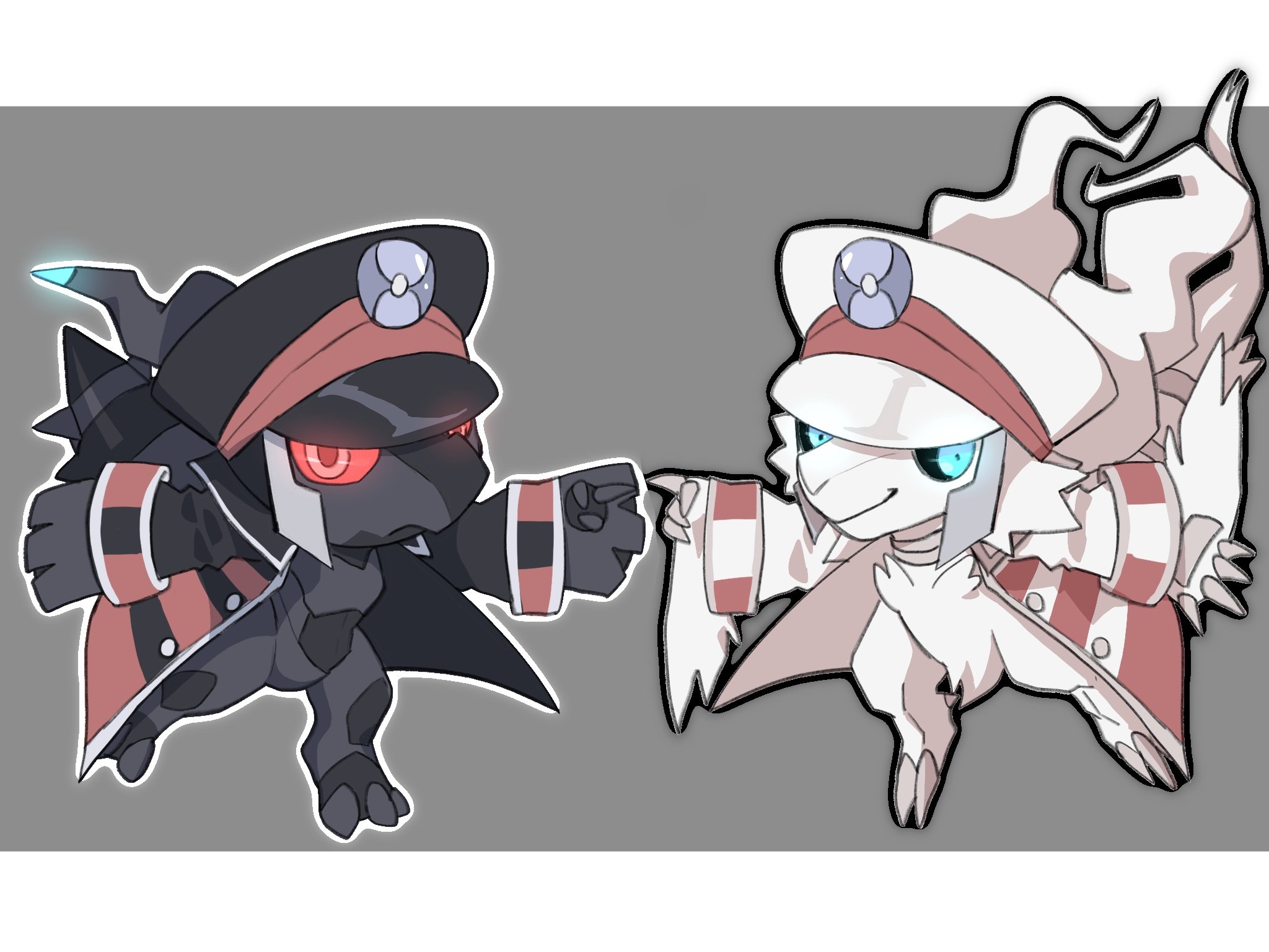 black_coat black_hat black_scales blue_eyes chibi choker claws closed_mouth coat dragon fluff fluffy frown gen_5_pokemon glowing glowing_eyes hat highres kanako_suddenly legendary_pokemon nintendo pointing pokemon pokemon_(creature) pokemon_black_and_white red_eyes reshiram scales sideburns smile white_coat white_fur white_hat wings zekrom