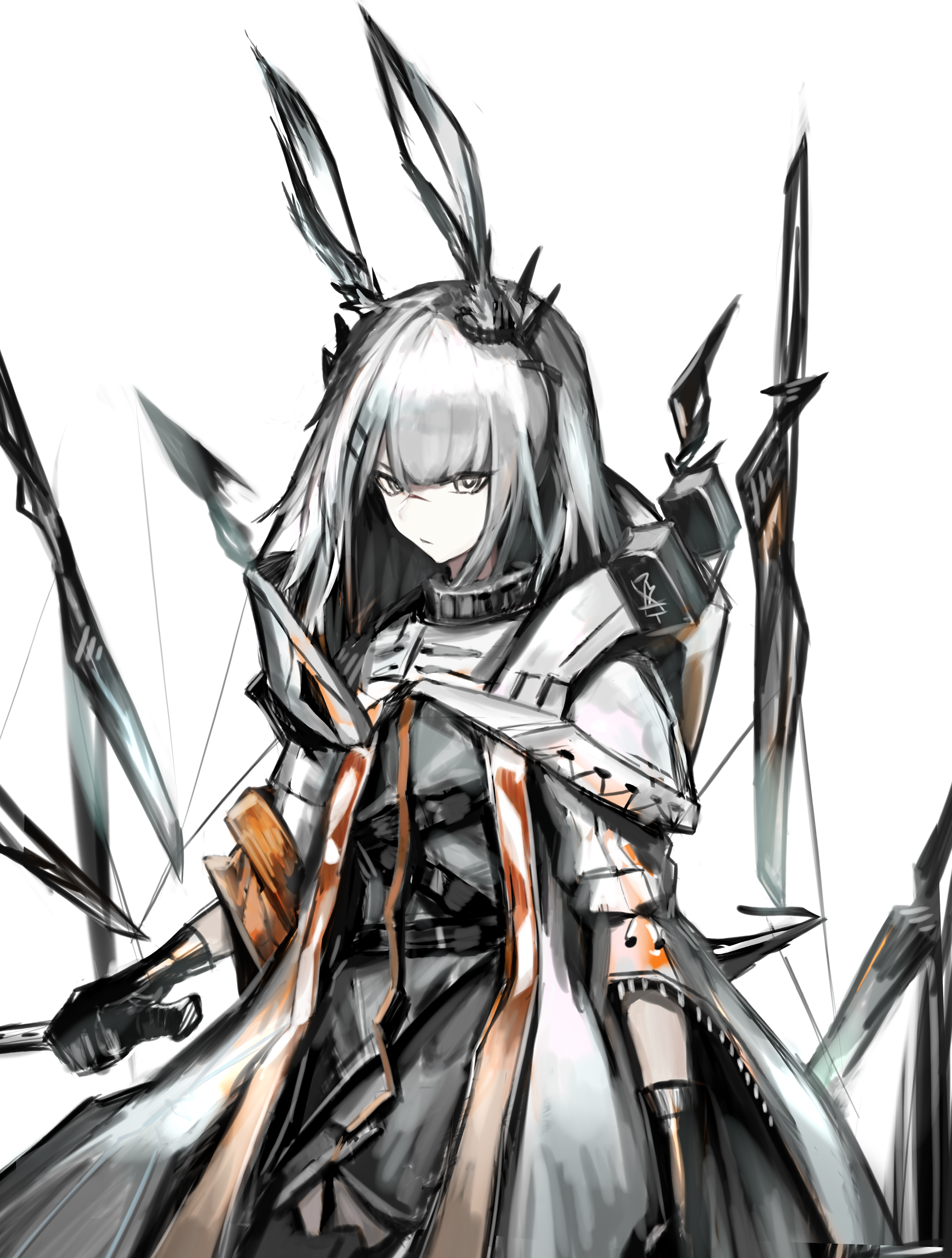 1girl absurdres animal_ears arknights black_dress black_gloves closed_mouth coat cowboy_shot dress frostnova_(arknights) gloves grey_eyes grey_hair hair_ornament hairclip highres holding holding_sword holding_weapon jacket long_hair looking_at_viewer rabbit_ears rabbit_girl ring_hair_ornament scar scar_on_face scar_on_nose sikadi_shigaoshou solo sword weapon white_coat