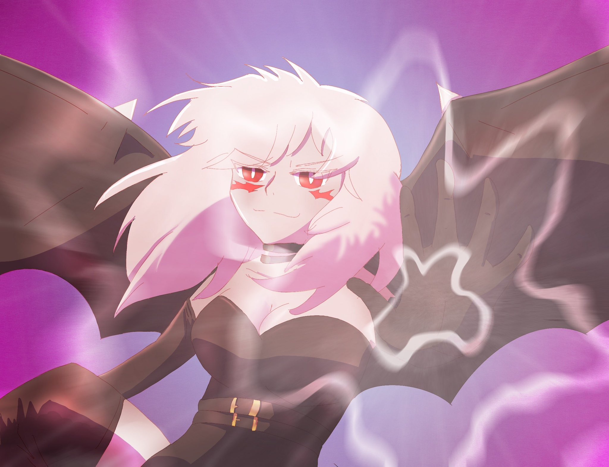 1girl belt digimon digimon_(creature) digimon_legendary_skies female_focus highres long_hair looking_at_viewer nutufumon red_eyes smile solo white_background wings