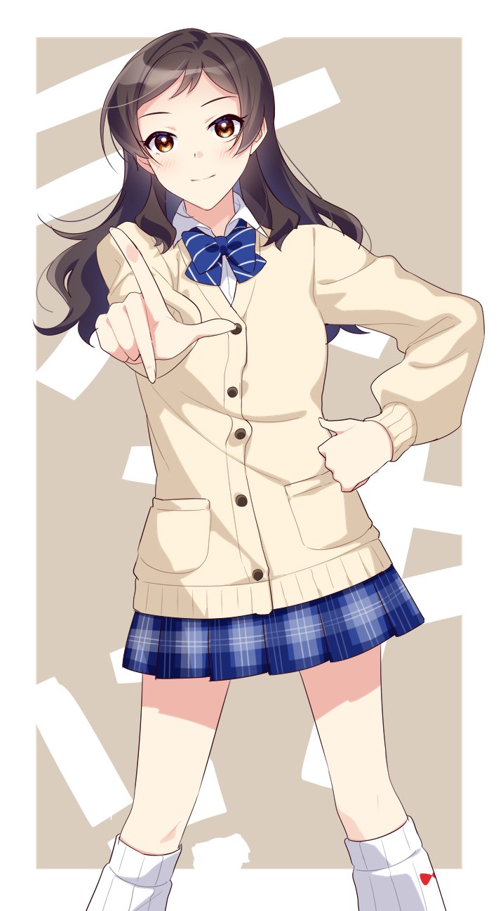 1girl black_hair blue_bow blue_bowtie bow bowtie brown_eyes closed_mouth collar collared_shirt cowboy_shot dot_nose eyelashes finger_gun grey_background hand_on_own_hip highres idolmaster idolmaster_million_live! idolmaster_million_live!_theater_days kitazawa_shiho kneehighs light_blush light_smile long_hair long_sleeves looking_at_viewer parted_bangs pleated_skirt school_uniform shirt sidelocks simple_background skirt socks solo standing straight_hair sweater touon wavy_hair white_collar yellow_sweater