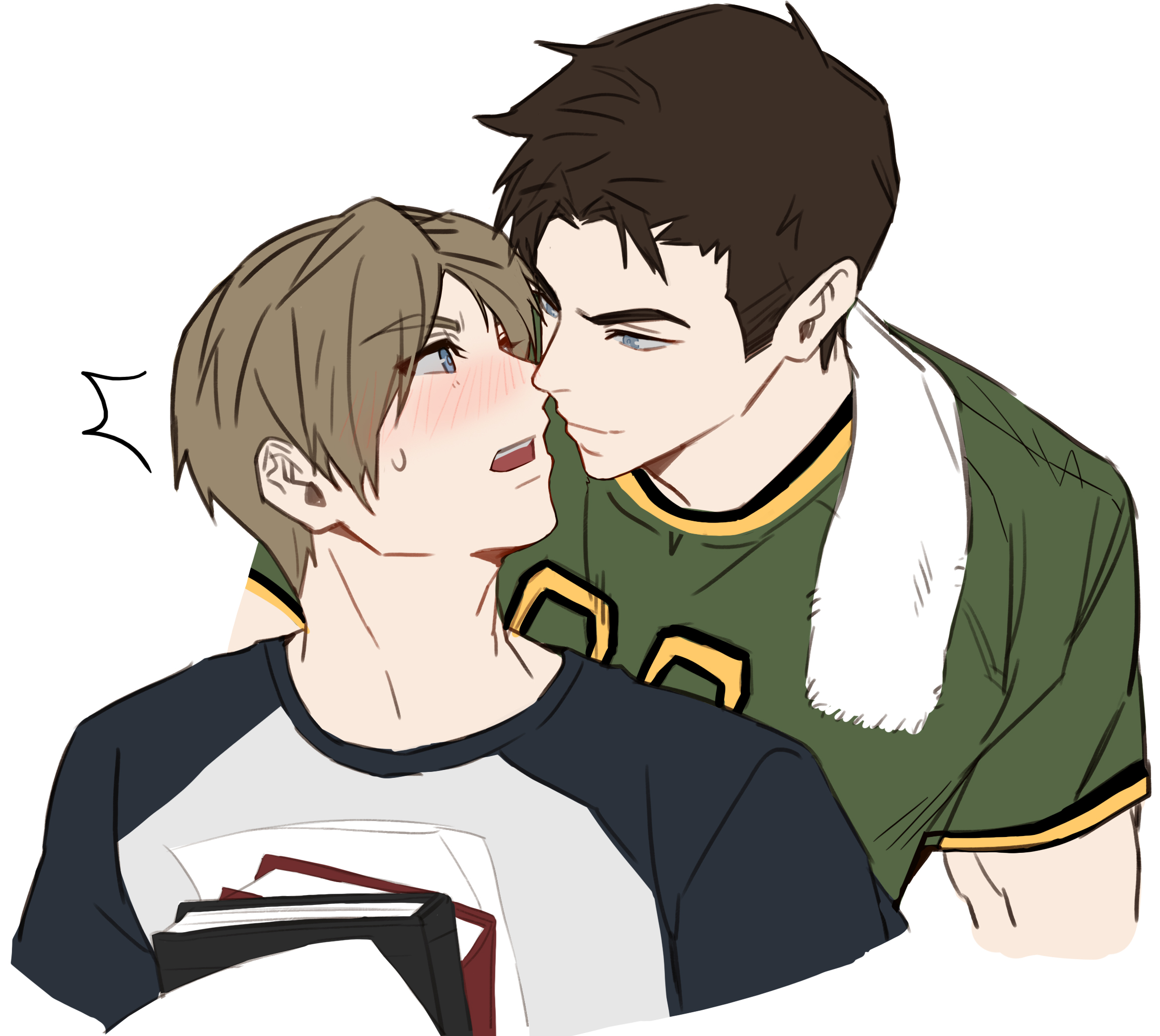 2boys ^^^ alternate_universe blonde_hair blue_eyes blush book brown_hair chris_redfield closed_mouth contemporary couple crew_neck cropped_arm cropped_torso eye_contact green_shirt highres holding holding_book jersey jujeop leon_s._kennedy looking_at_another male_focus multicolored_shirt multiple_boys nervous_sweating notice_lines open_mouth resident_evil shirt short_sleeves simple_background smile surprised sweat sweatdrop teeth towel towel_around_neck upper_body upper_teeth_only white_background yaoi